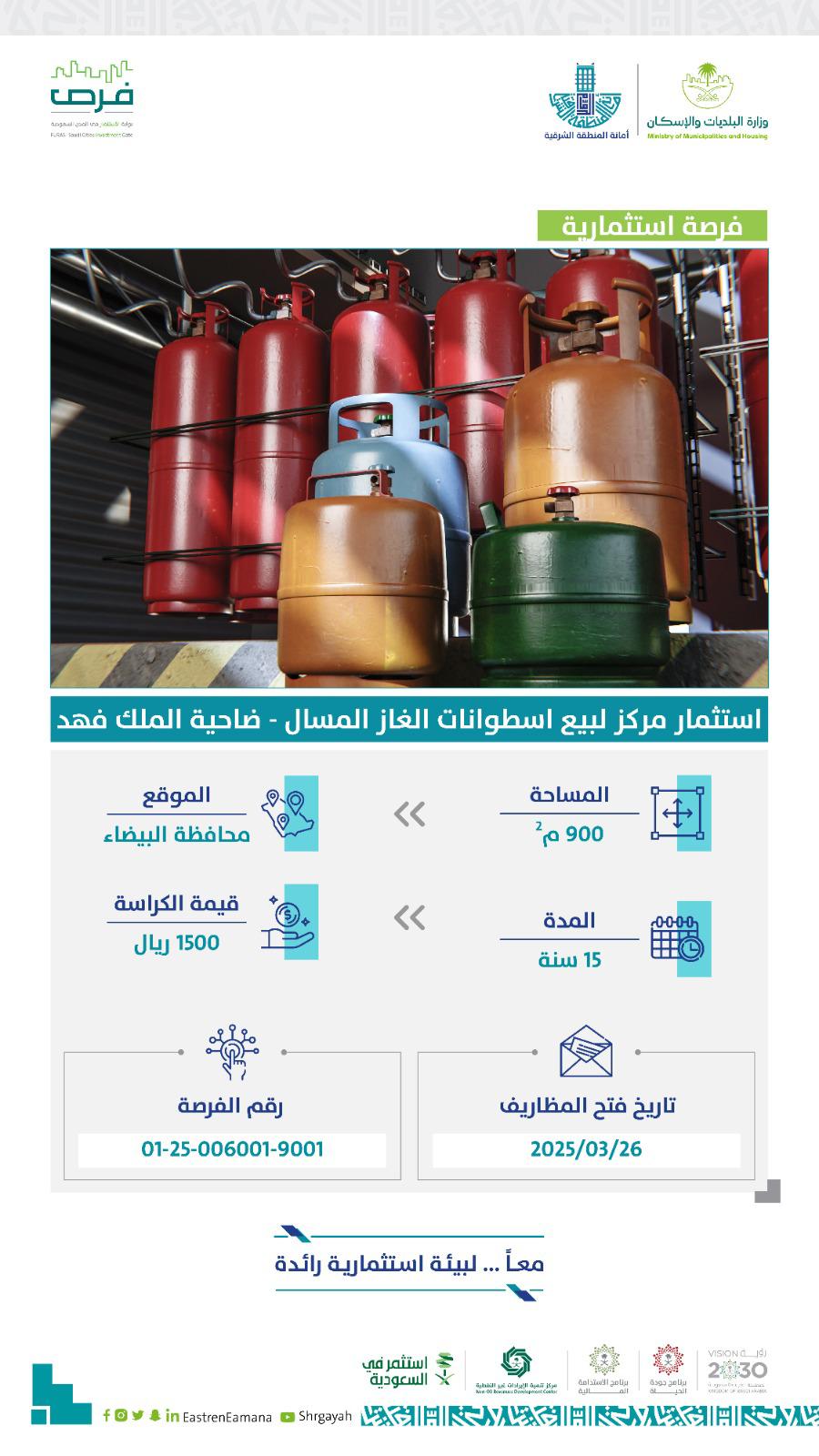 كما طرحت أمانة المنطقة فرصة استثمار مركز لبيع أسطوانات الغاز المسال في ضاحية الملك فهد، بمساحة 900 متر مربع ومدة عقد تمتد إلى 15 سنة. يسهم هذا المشروع في تلبية احتياجات السكان والمشروعات التجارية.