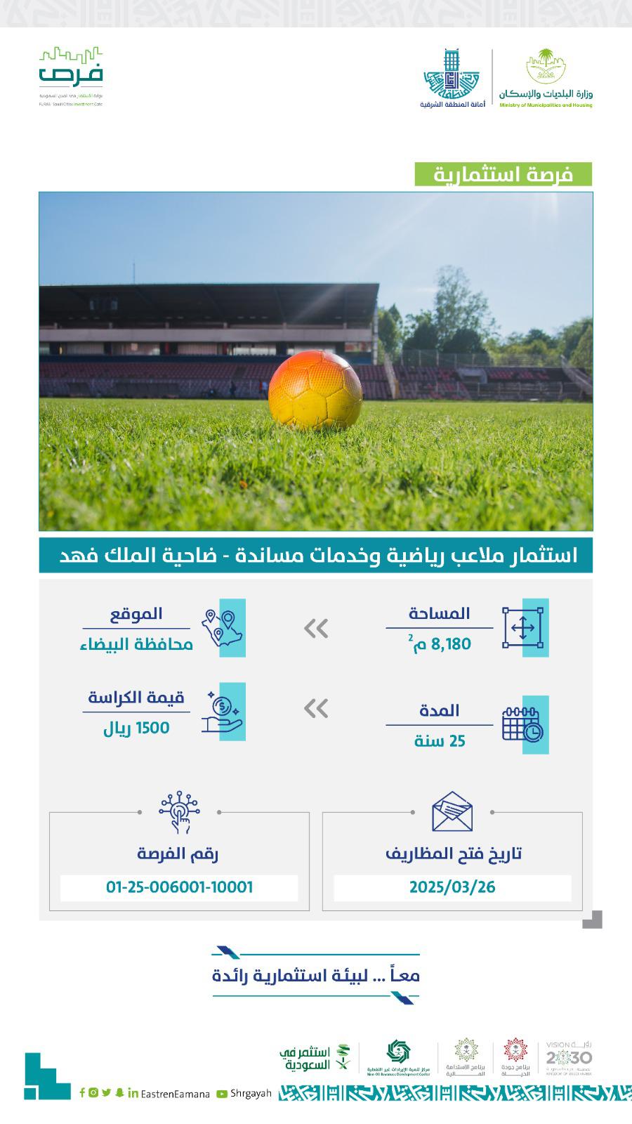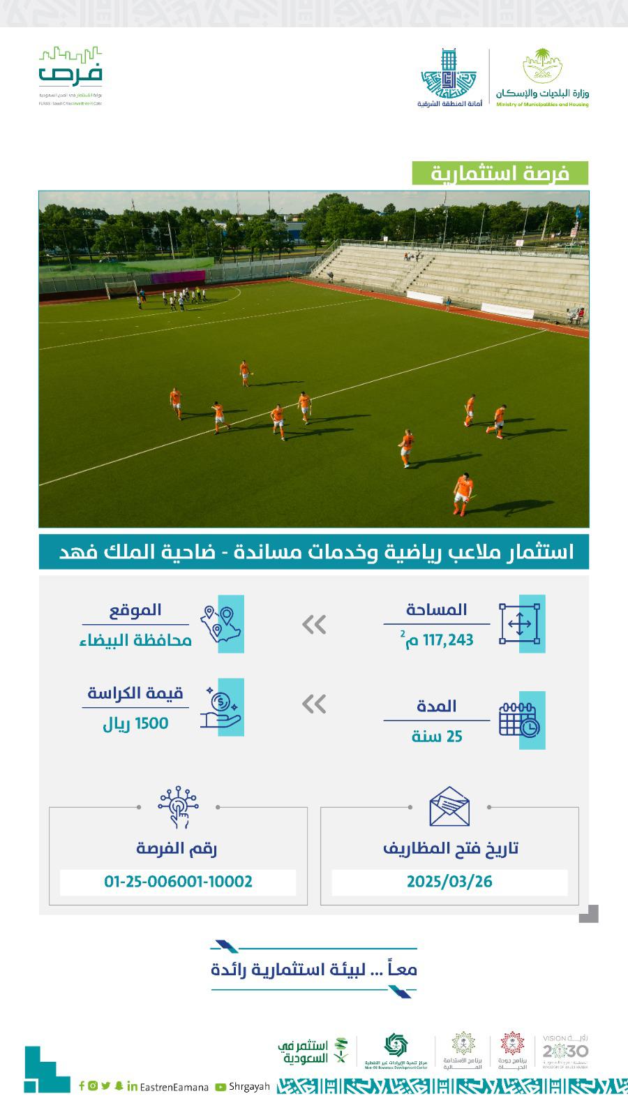 كما تشمل الفرص الاستثمارية استثمار ملاعب رياضية وخدمات مساندة في ضاحية الملك فهد بمحافظة البيضاء، بمساحة إجمالية تبلغ 117.243مترًا مربعًا ومدة عقد تصل إلى 25 سنة. يُعد هذا المشروع خطوة هامة نحو تطوير البنية التحتية الرياضية في المنطقة، بما يساهم في تعزيز الأنشطة الرياضية والمرافق العامة.