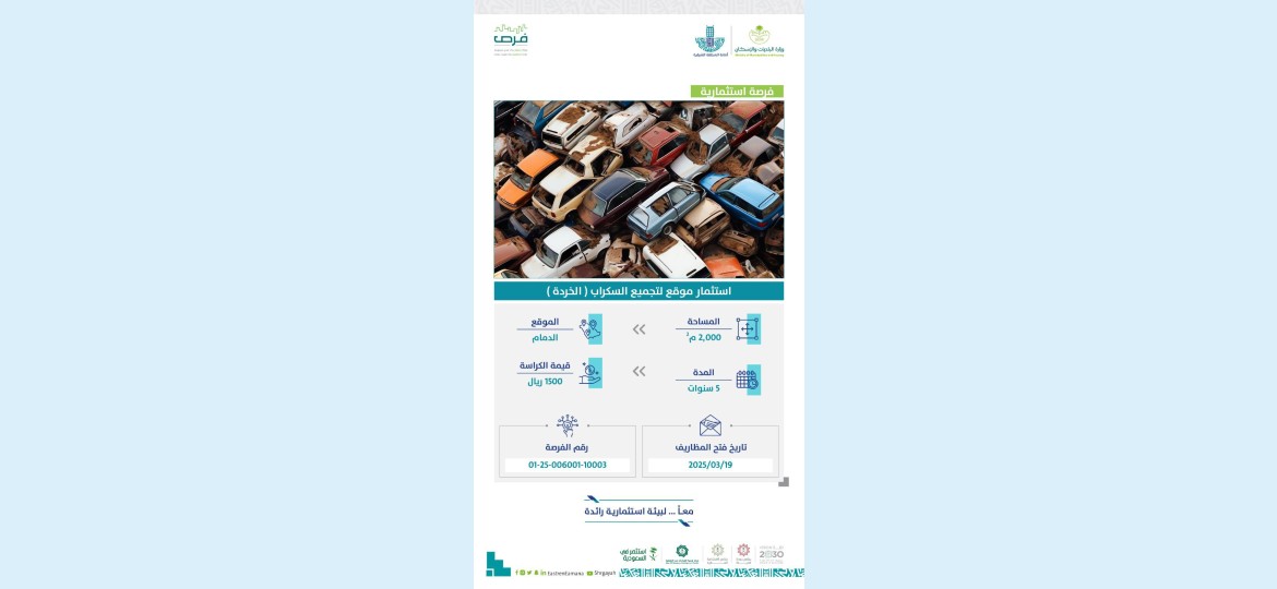من أبرز هذه الفرص الاستثمارية موقعين لتجميع السكراب (الخردة) في الدمام، بمساحة 2.000 متر مربع ومدة عقد تصل إلى 5 سنوات، مما يوفر فرصًا للمستثمرين في قطاع إعادة التدوير، حيث يتيح بيئة ملائمة لتحفيز الاستثمارات في هذا القطاع الحيوي.