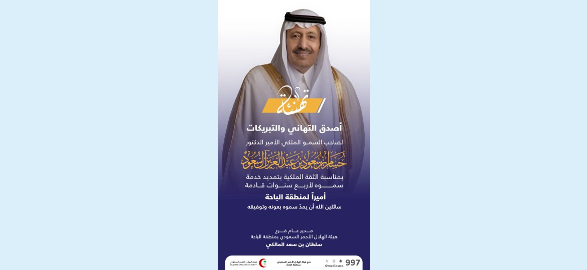 رفع مدير عام فرع هيئة الهلال الأحمر، الأستاذ سلطان بن سعد المالكي، أصدق التهاني والتبريكات لمقام صاحب السمو الملكي الأمير حسام بن سعود بن عبدالعزيز، بمناسبة الثقة الملكية السامية التي قضت بتمديد فترة عمل سموه أميرًا لمنطقة الباحة لمدة أربع سنوات قادمة.