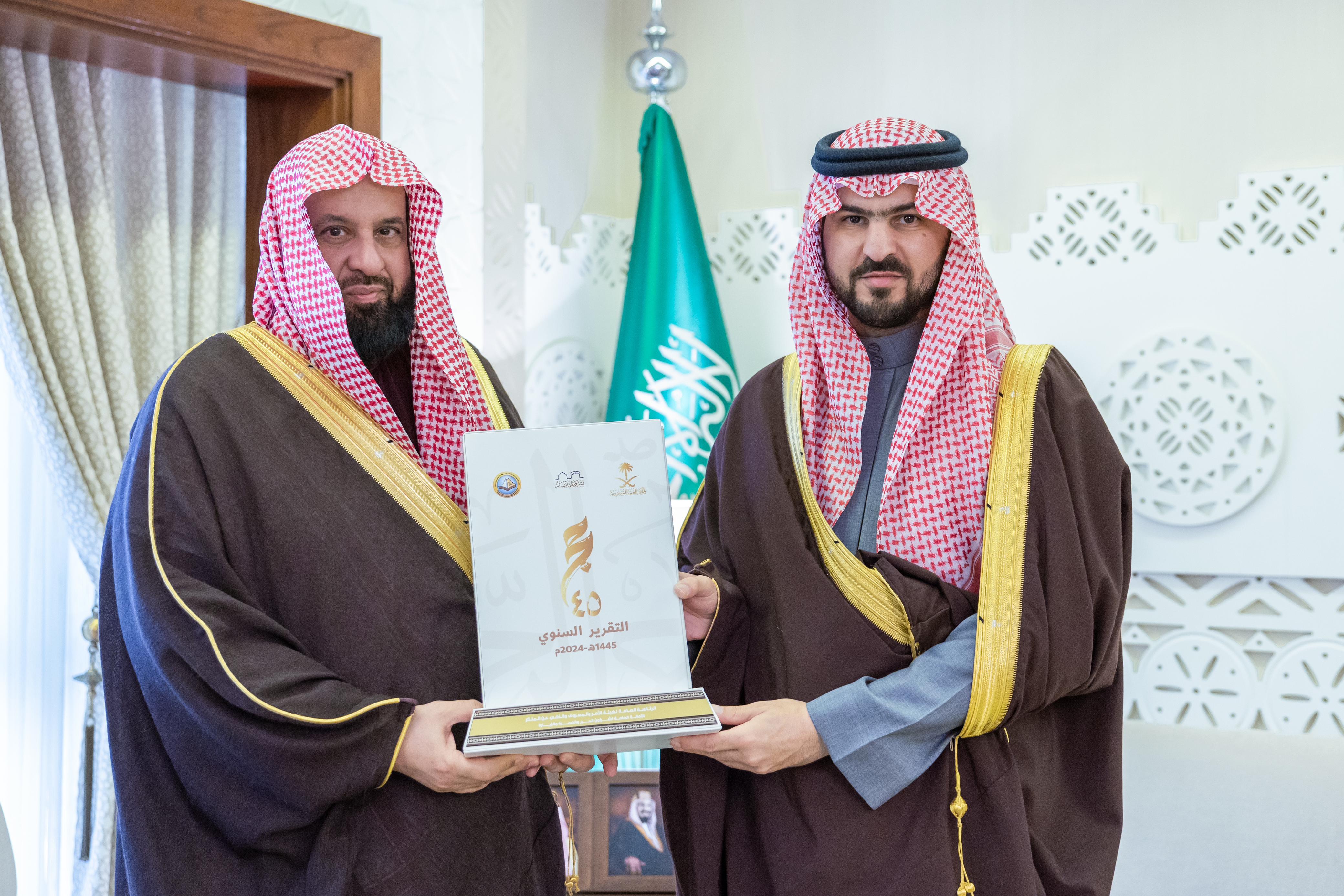 عقب ذلك تسلّم سموه من معالي الرئيس العام التقرير السنوي لمشاركة الرئاسة في الحج لعام ١٤٤٥ه، ودرعًا تذكاريًا يحوي رمز الاستجابة السريعة لإصدارات الرئاسة العلمية.