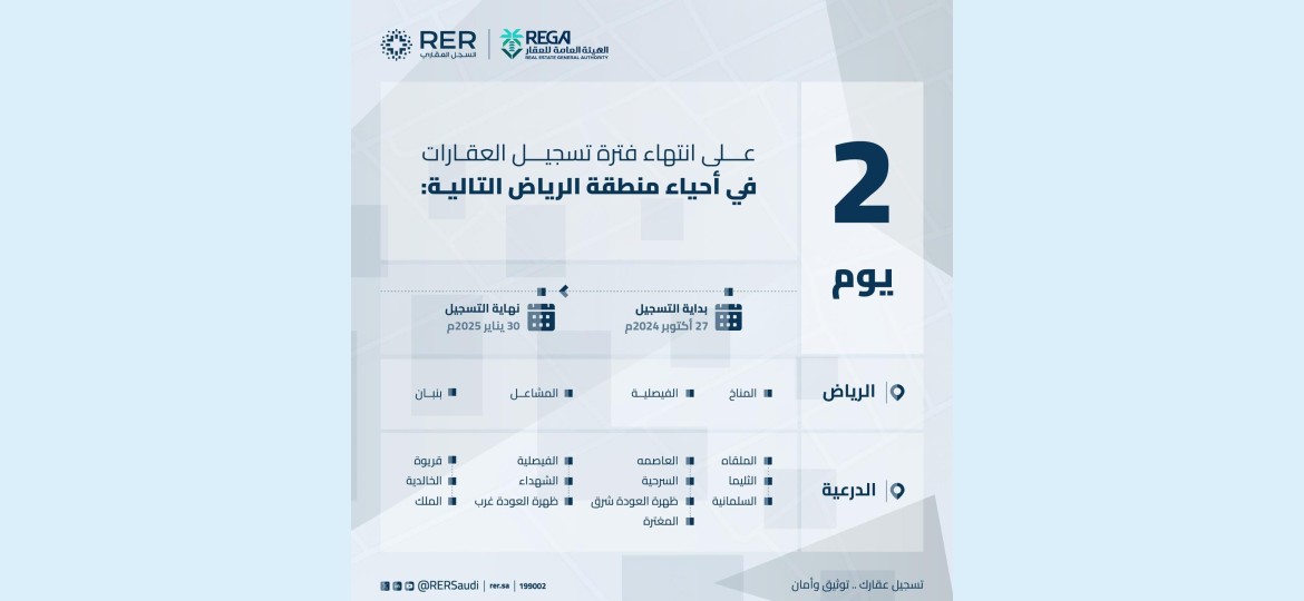 أعلنت الهيئة العامة للعقار عن قرب انتهاء المهلة المحددة للتسجيل العيني الأول للعقار لـ (4) أحياء بمدينة الرياض، و (13) حيًا بمحافظة الدرعية، وذلك بنهاية يوم الخميس الموافق 30 يناير 2025م.