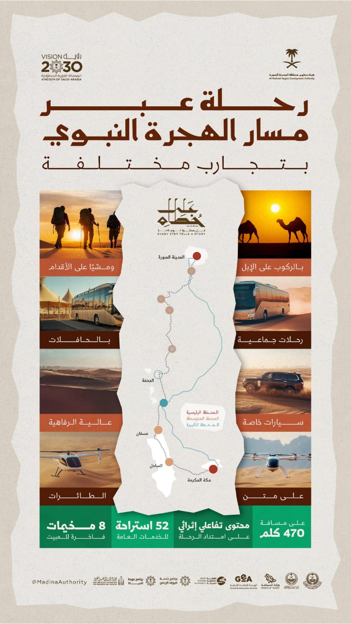 هذا المشروع يمتد على مسافة تتجاوز 470 كيلومترًا، ويتيح للزوار فرصة مميزة لتتبع خطوات النبي الكريم -صلى الله عليه وسلم- وزيارة المواقع التي ارتبطت بتلك الرحلة العظيمة.