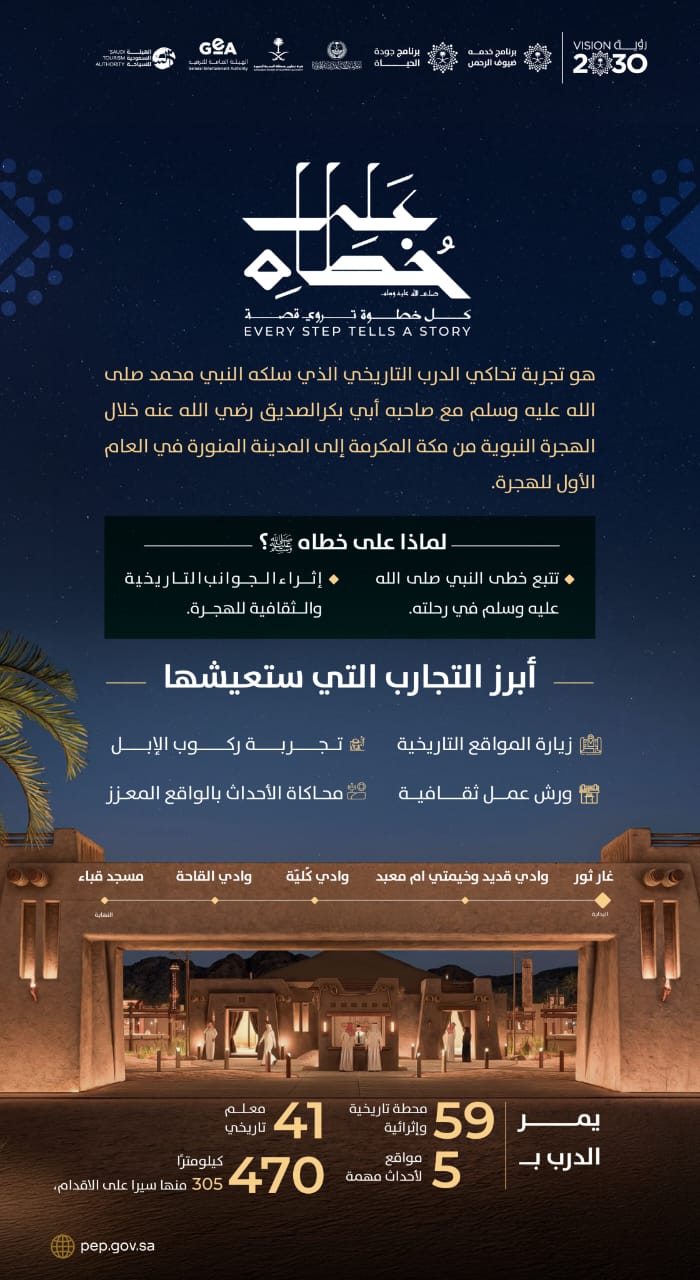 يعد مشروع درب الهجرة النبوية وتجربة "على خُطاه" محاكاة للدرب التاريخي الذي سلكه النبي -صلى الله عليه وسلم- خلال الهجرة، وهو شاهدًا حيًا على ما توليه القيادة الرشيدة من اهتمام بالمواقع التاريخية.