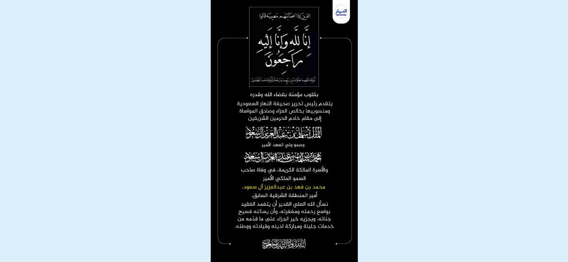 بقلوب مؤمنة بقضاء الله وقدره، يتقدم رئيس تحرير صحيفة النهار السعودية ومنسوبيها بخالص العزاء وصادق المواساة إلى مقام خادم الحرمين الشريفين الملك سلمان بن عبد العزيز آل سعود، وسمو ولي العهد الأمير محمد بن سلمان بن عبد العزيز، والأسرة المالكة الكريمة، في وفاة صاحب السمو الملكي الأمير محمد بن فهد بن عبد العزيز آل سعود، أمير المنطقة الشرقية السابق.