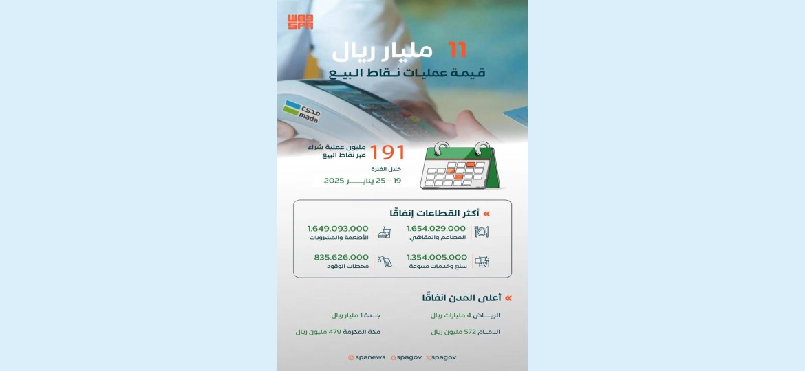 بلغ عدد عمليات نقاط البيع في المملكة خلال المدة من 19 - 25 يناير 2025م, 191.451.000 عملية، بقيمة 11.172.911.000 ريال، مقابل 11.776.267.000 ريال، عن المدة السابقة نفسها.