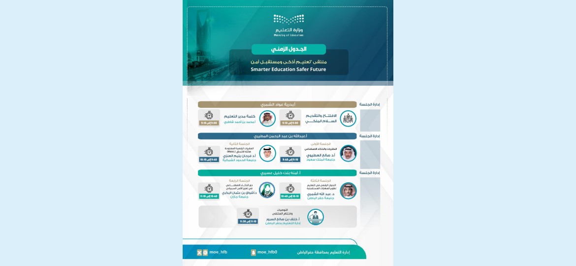 برعاية مدير التعليم بمحافظ حفرالباطن الأستاذ محمد بن أحمد شاطري عقد ملتقى " تعليم ذكي ومستقبل آمن" بتنظيم من قسم التطوير والنحول برئاسة الأستاذة عمشاء بنت زايد الشمري وبمشاركة نخبة من المختصين والأكاديمين بالمملكة ، وافتتح الملتقى بالسلام الملكي ثم ألقى مدير تعليم حفر الباطن أحمد شاطري كلمة رحب فيها بالحضور والمشاركين مؤكداً بالوقت نفسه على أهمية الملتقى وما يعود على الجميع من نفع ، ثم اتاحت مقدمة الحفل الأستاذة بدرية الشمري لافتتاح الجلسات والتي بدأت بالجلسة الأولى للأستاذ الدكتور صالح العطيوي من جامعة الملك سعود بعنوان " النظريات والذكاء الاصطناعي " والجلسة الثانية للأستاذ الدكتور فرحان يتيم العنزي من جامعة الحدود الشمالية بعنوان " الفقرات الرقمية المفتوحة " وأدار الجلستان الأستاذ عبدالله بن عبدالرحمن المطيري .
