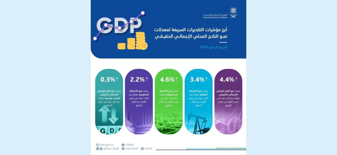 يذكر أن الهيئة العامة للإحصاء ستصدر النتائج الفعلية للناتج المحلي الإجمالي الحقيقي للربع الرابع من عام 2024 في شهر مارس القادم لعام 2025.