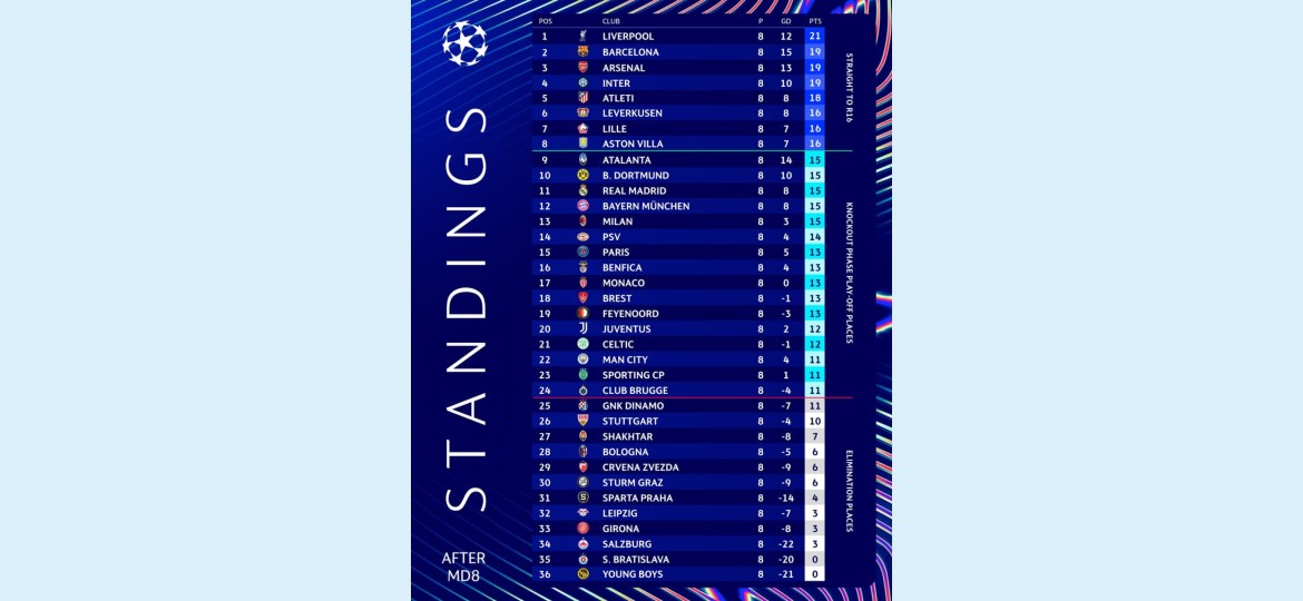 اختتمت مباريات مرحلة الدوري في دوري أبطال أوروبا، حيث تأهلت 8 فرق مباشرة إلى دور الـ16، بينما ستخوض 16 فريقًا مواجهات الملحق لتحديد 8 متأهلين آخرين إلى الدور ثمن النهائي.