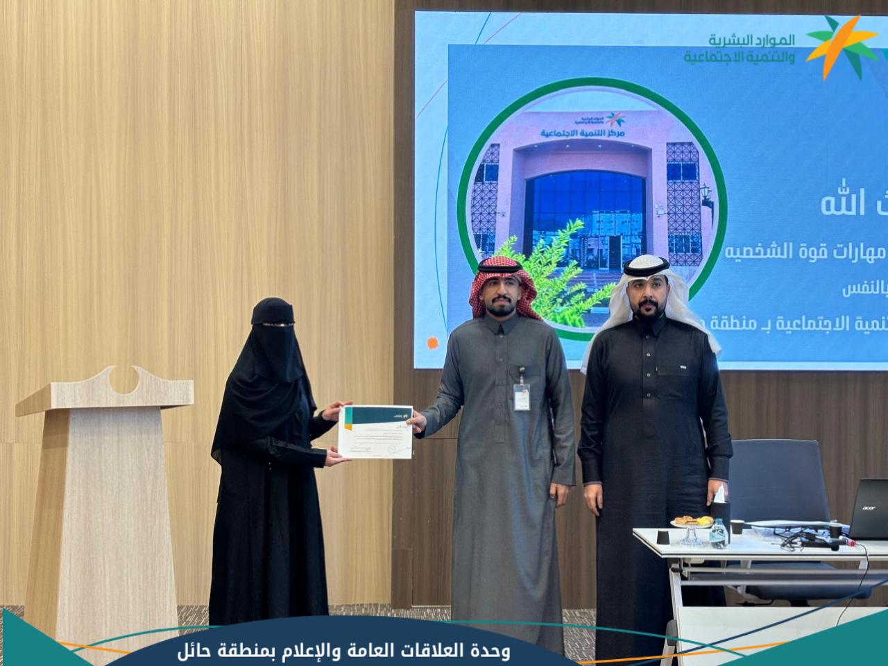 أقام  مركز التنمية الاجتماعية  بمنطقة حائل برنامج تطويري بعنوان " مهارات قوة الشخصية والثقة بالنفس " وكان الفئة المستهدفة من هذا البرنامج  جميع فئات المجتمع من باحثي عن عمل وأبناء مستفيدي الضمان الاجتماعي، وقدمها الدكتور عقيل الحسيني الحاصل على دكتوراه في علم الاجتماع ، وقد تم تنفيذ البرنامج تحت إشراف وحضور مباشر من مدير  مركز التنمية الاجتماعية  بحائل الأستاذ محمد الثابت.