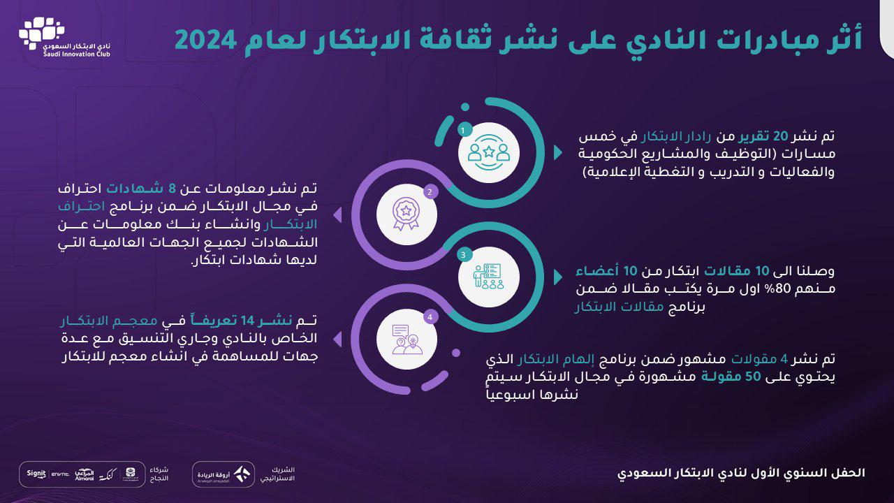 نادي الابتكار السعودي في عامه الأول يتصدر أندية الهواة في المملكة حيث انتهى عام 2024 م بأكثر من 720 عضو ومبدع ومبتكر في جميع مناطق المملكة؛ ليلفت الأنظار ويلقى الإعجاب ويستقطب الشراكات النوعية الداعمة لأنشطة وفعاليات ومبادرات النادي ، حيث أطلق النادي 4 مبادرات ( رادار الابتكار ، ثقافة الابتكار ، صوت الابتكار، المبتكر الصغير) ، ونفذ 32 فعالية ( لقاءات الابتكار، قهوة الابتكار، زيارات الابتكار، أدب الابتكار)؛ والتي أسهمت في تحقيق 84 ساعة إثراء للمعرفة في مجال الابتكار .