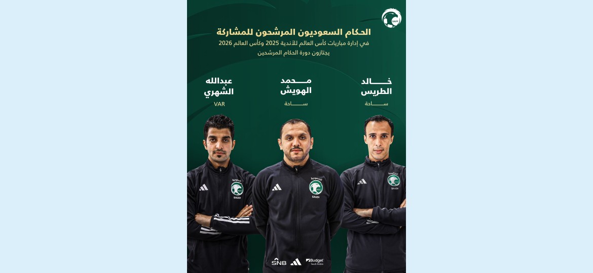 اجتاز الحكمان السعوديان الدوليان محمد الهويش وخالد الطريس دورة الحكام المرشحين للمشاركة في إدارة مباريات  كأس العالم  للأندية 2025 والمنتخبات 2026، بإشراف الإيطالي بييرلويجي كولينا رئيس لجنة الحكام في الفيفا، والقطري هاني بلان نائب رئيس اللجنة، والسويسري ماسيمو بوساكا مدير دائرة الحكام بالفيفا.