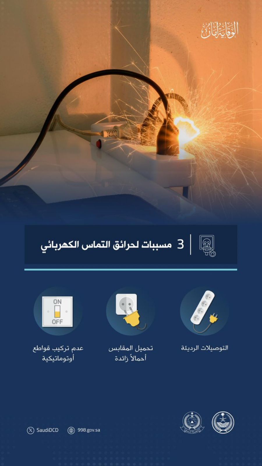 وحددت المديرية أبرز (3) أسباب لوقوع حرائق التماس الكهربائي، وهي: التوصيلات الرديئة، وتحميل المقباس أحمالًا زائدة، وعدم تركيب قواطع أوتوماتيكية.