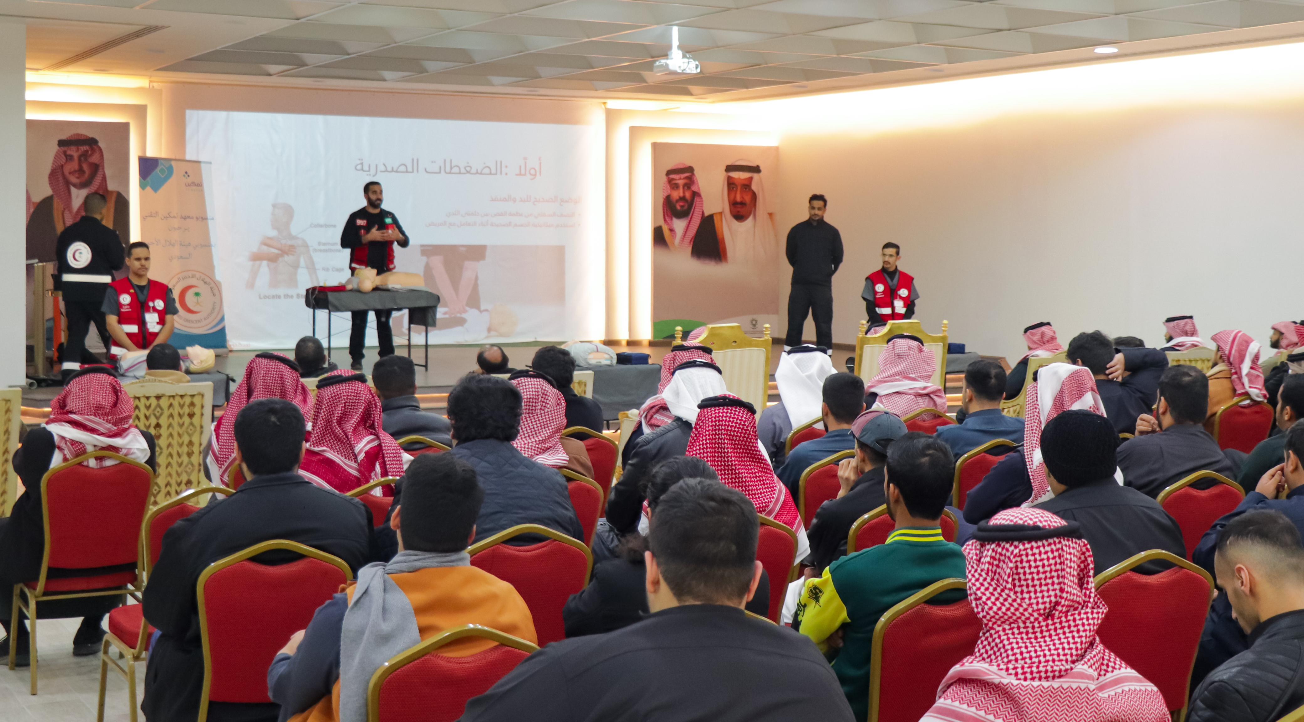 وفي هذا الإطار، قام فرع الهيئة بتدريب منسوبي معهد تمكين التقني، حيث قدم فريق مختص من الهلال الأحمر برنامجًا تدريبيًا حول أساسيات الإسعافات الأولية، مثل التعامل مع الإغماء، الإنعاش القلبي الرئوي، وإسعاف الإصابات المختلفة، إضافة إلى التدريب على استخدام أجهزة مزيل الرجفان الآلي (AED)، إلى جانب تطبيقات عملية لضمان استيعاب المشاركين لكيفية التصرف السليم في الحالات الطارئة. وقد استفاد من التدريب أكثر من 50 مشاركًا، الذين أشادوا بأهميته في تحسين مهاراتهم الإسعافية.