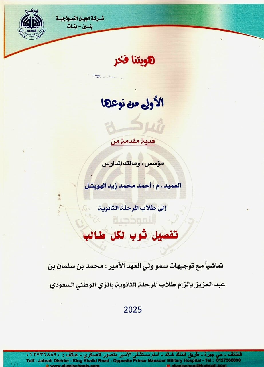 أطلق مالك مدارس الجيل الأهلية، العميد م. أحمد بن محمد بن زيد الهويشل، مبادرة "هويتنا فخرنا"، التي تهدف إلى تفصيل ثوب خاص لكل طالب في المرحلة الثانوية بمدارس الجيل الأهلية. تأتي هذه المبادرة تماشيًا مع توجيه صاحب السمو الملكي الأمير محمد بن سلمان بن عبدالعزيز آل سعود، ولي العهد حفظه الله، لتعزيز الهوية الوطنية والاعتزاز بالثقافة والتراث السعودي.