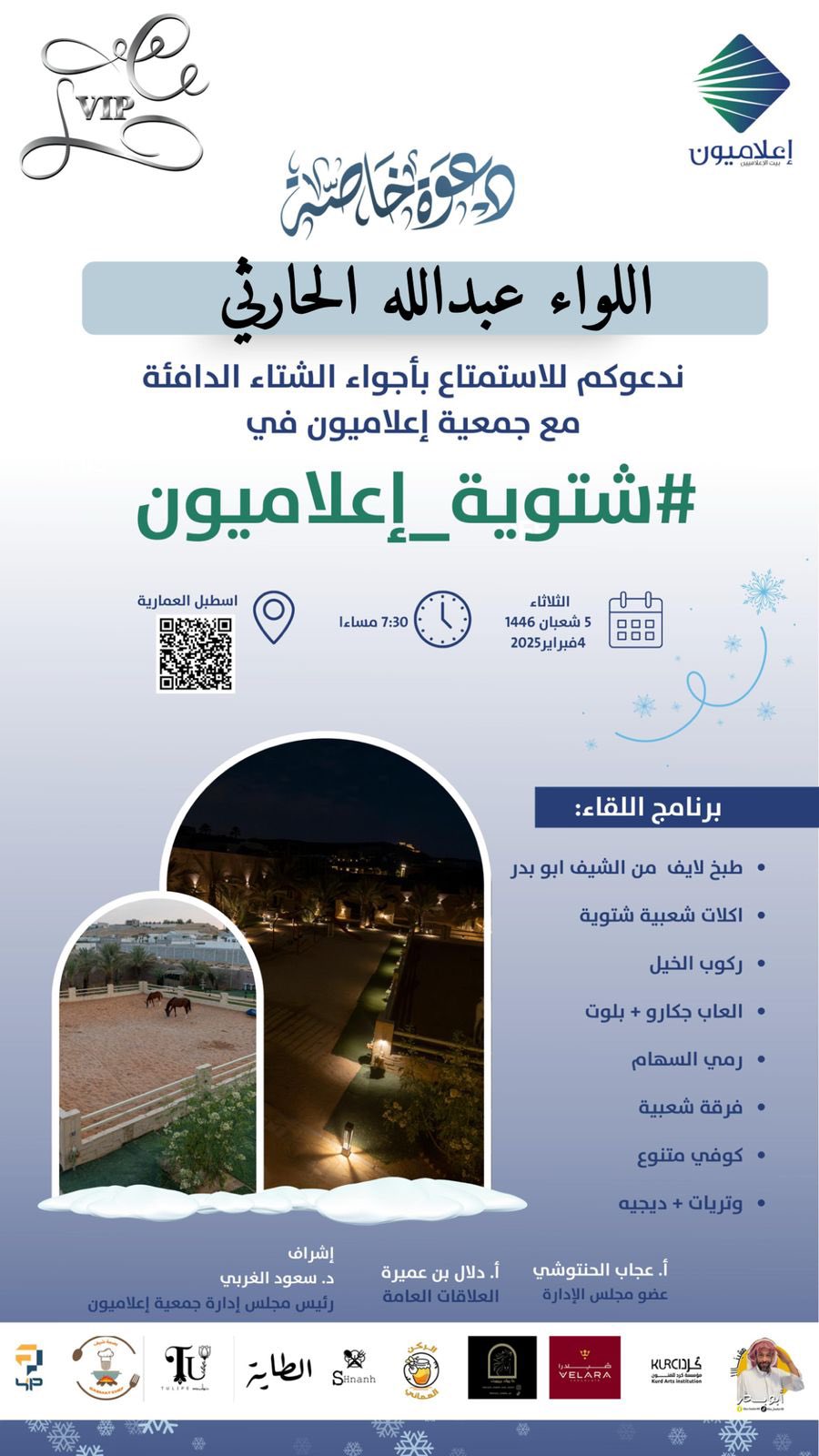 شكر خاص لكافة رعاة اللقاء وشكرًا لكل من حضر، ولكل من تكبد عناء السفر ليكون جزءًا من هذه الليلة المضيئة، فاللقاء بكم هو روح الشتاء ودفؤه الحقيقي.