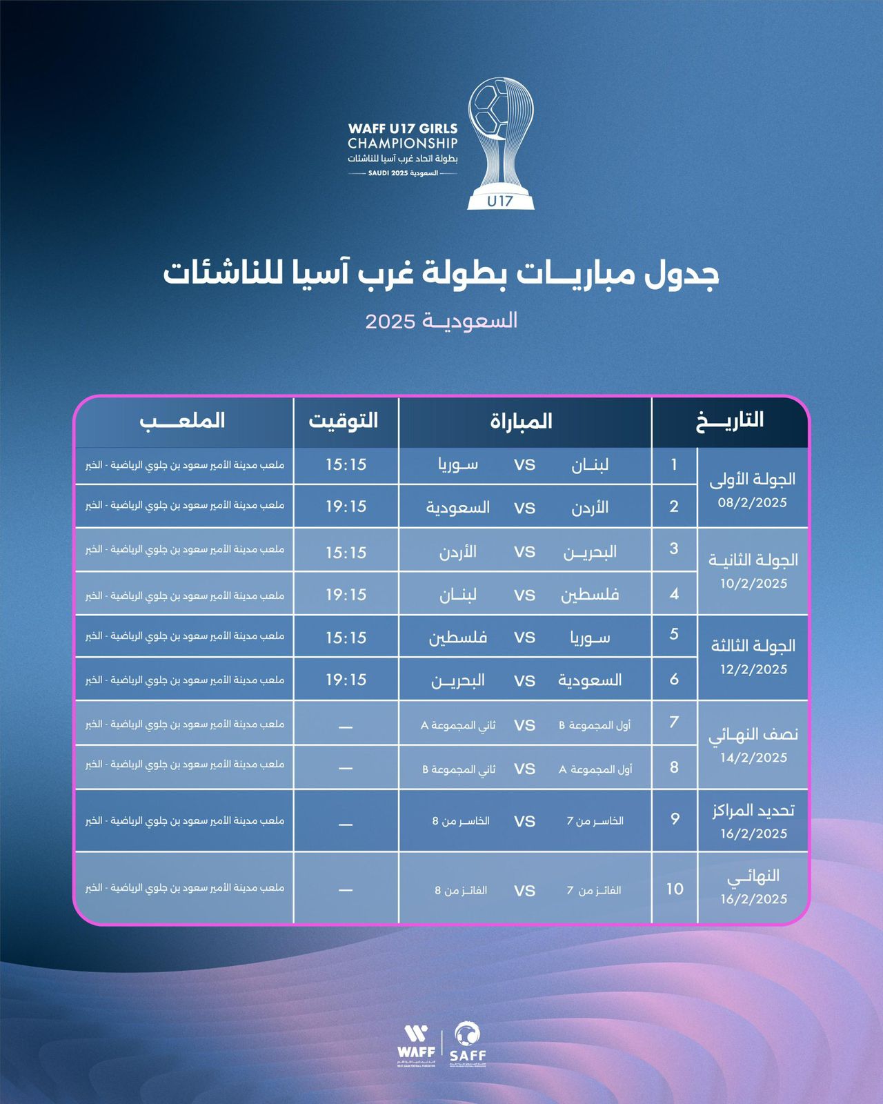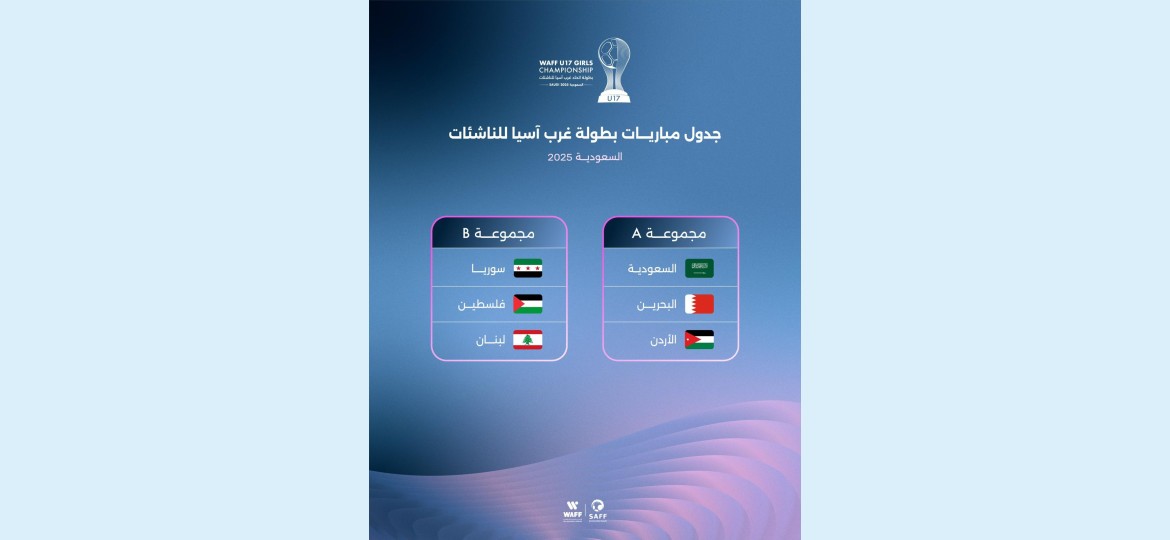 تنطلق غًدا السبت  بطولة اتحاد غرب آسيا  للناشئات تحت 17 عاماً، والتي تستضيفها مدينة الخبر خلال الفترة من 8 حتى 16 فبراير الجاري "السعودية، البحرين، الأردن، سوريا، فلسطين، بمشاركة 6 منتخبات وهم لبنان".