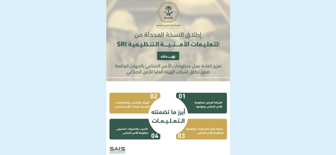 أطلقت الهيئة العليا للأمن الصناعي النسخة المحدثة من التعليمات الأمنية التنظيمية (SRI) التي تهدف إلى تعزيز كفاءة عمل منظومات الأمن الصناعي بالجهات الواقعة ضمن نطاق إشراف الهيئة.
