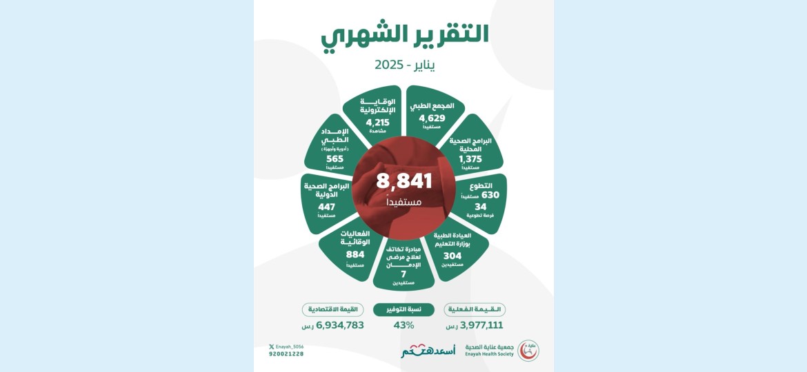 وأشار الدكتور المطيري إلى أن مجمع عيادات عناية الطبي قدم خدماته لـ 4,629 مستفيدًا، بقيمة اقتصادية 1,021,790 ريالًا. وبلغ عدد المستفيدين من الإمداد الطبي 565 مستفيدًا، بقيمة اقتصادية 217,429 ريالًا. واستفاد من العمل الصحي الدولي 447 مستفيدًا، بقيمة اقتصادية 833,865 ريالاً. بالإضافة إلى ذلك، استفاد من عيادة وزارة التعليم 304 مستفيدين. وفي إطار حماية المجتمع من آفة الإدمان والمخدرات، قدمت الجمعية العلاج لـ 7 مستفيدين، بقيمة اقتصادية 315,000 ريال.