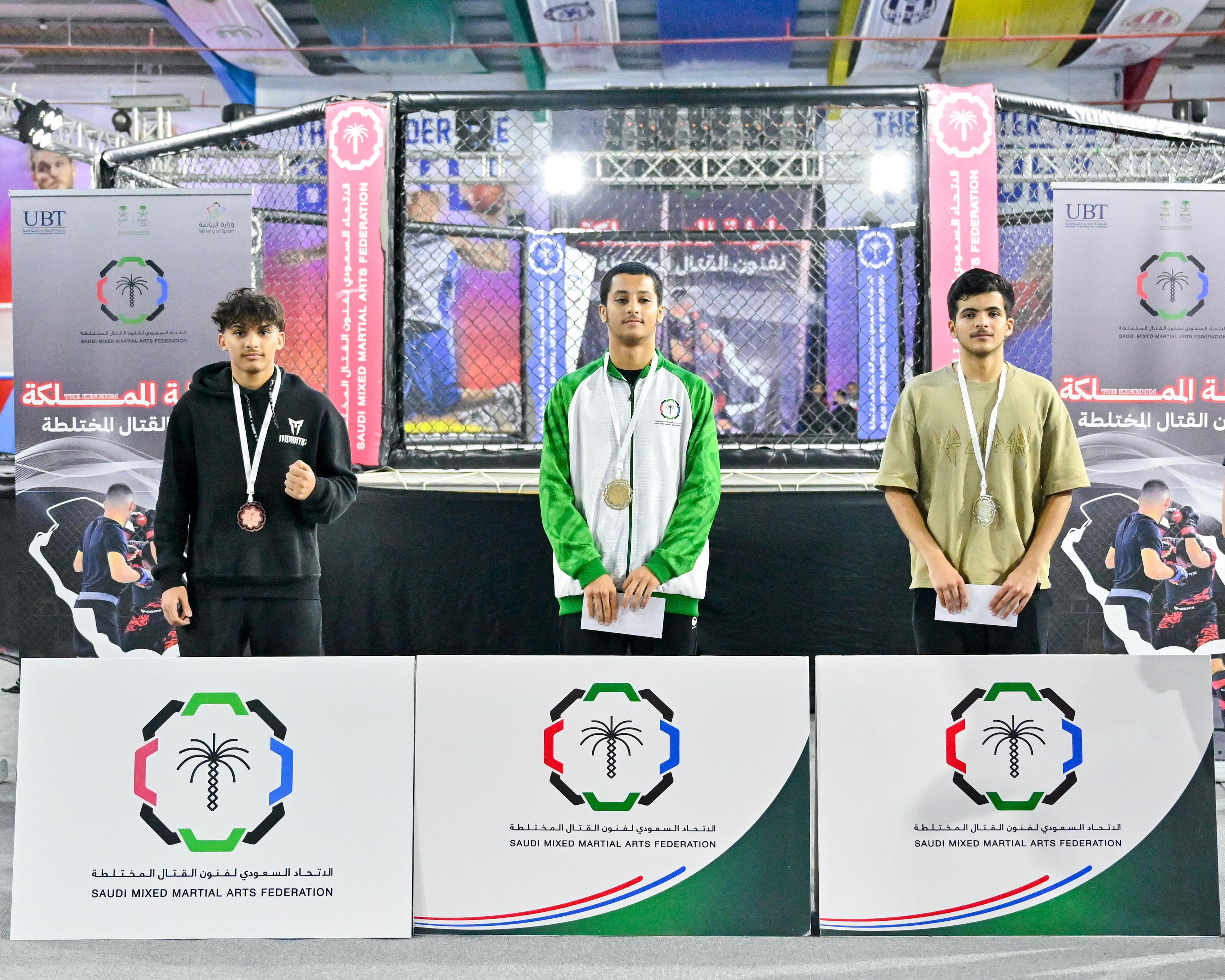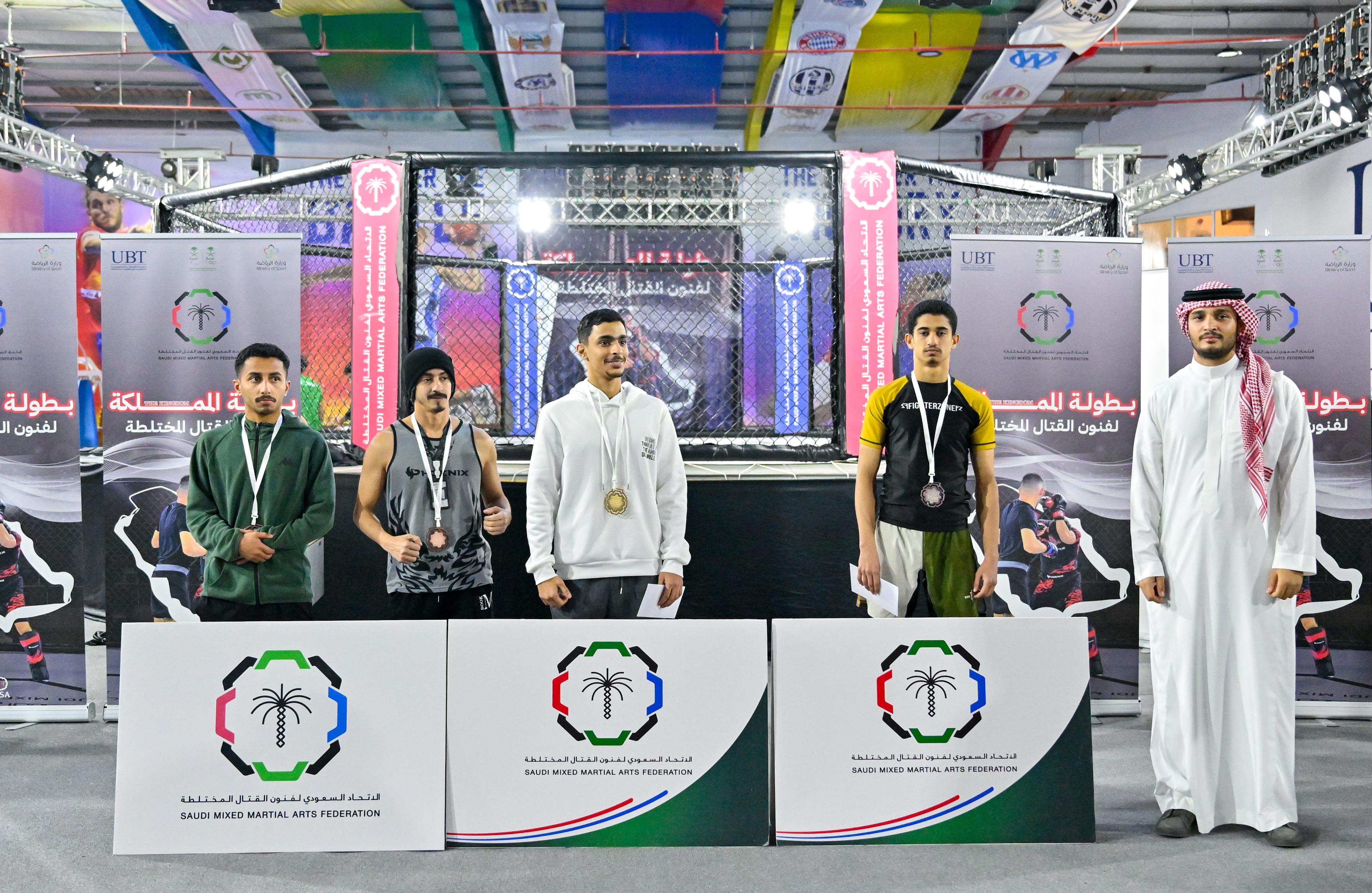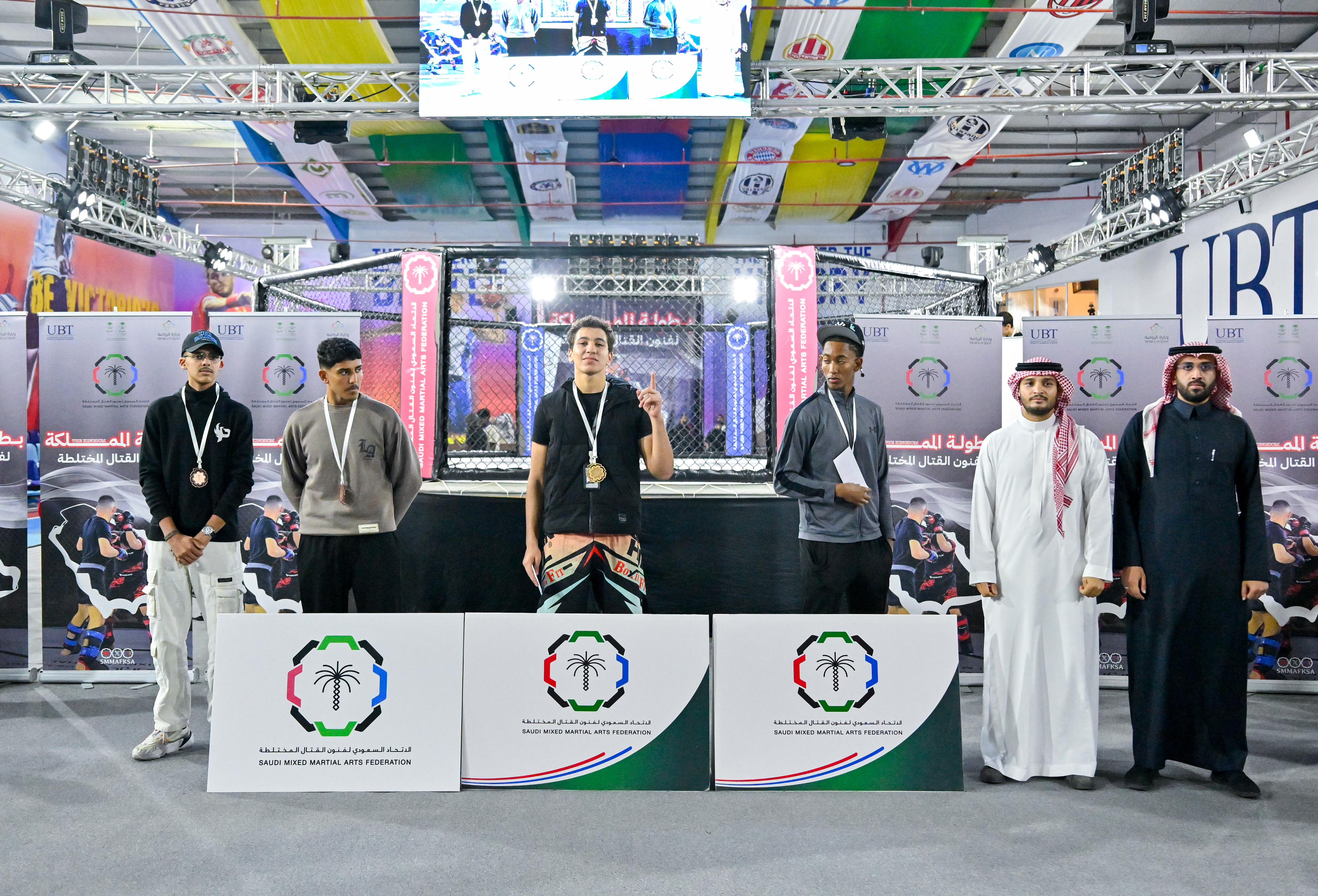 توِّج رئيس الاتحاد السعودي لفنون القتال المختلطة عبدالعزيز جليدان والمدير التنفيذي للاتحاد عبدالله الهزاع، يوم أمس، الفائزين في  بطولة المملكة  لفنون القتال المختلطة للفئات الثلاث (ناشئين وشباب وكبار ) التي أقيمت على صالة جامعة الأعمال والتكنولوجيا بمحافظة جدة.