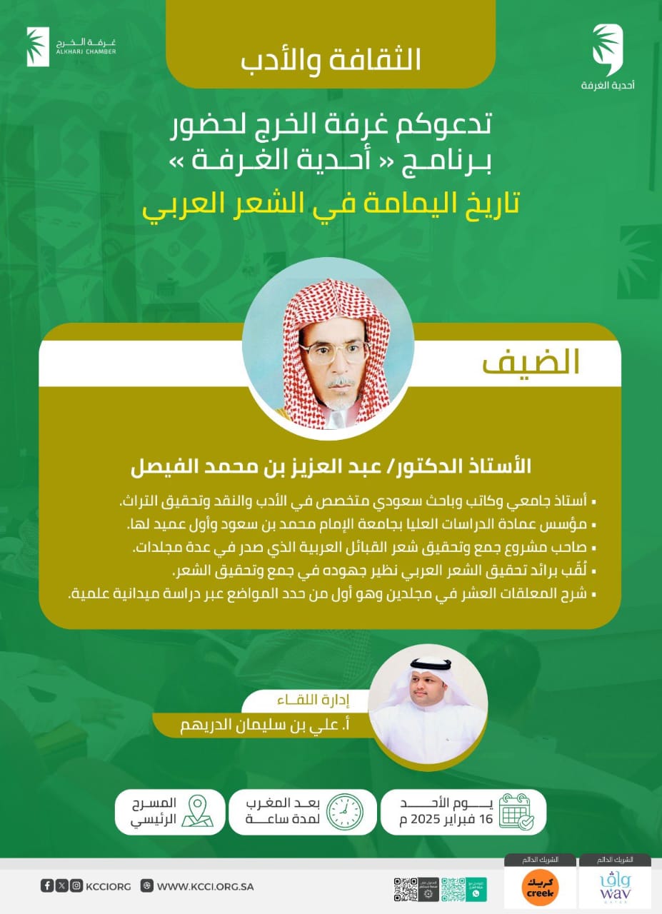 تستضيف غرفة الخرج يوم الأحد المقبل 9 يناير، بعد صلاة المغرب مباشرة، البروفيسور عبدالعزيز الفيصل في لقاء ثقافي بعنوان "تاريخ اليمامة في الشعر العربي". في هذا اللقاء، سيستعرض الدور التاريخي والثقافي لمنطقة اليمامة في الشعر العربي، مُبرزًا تأثيرها العميق على الأدب العربي عبر العصور المختلفة.