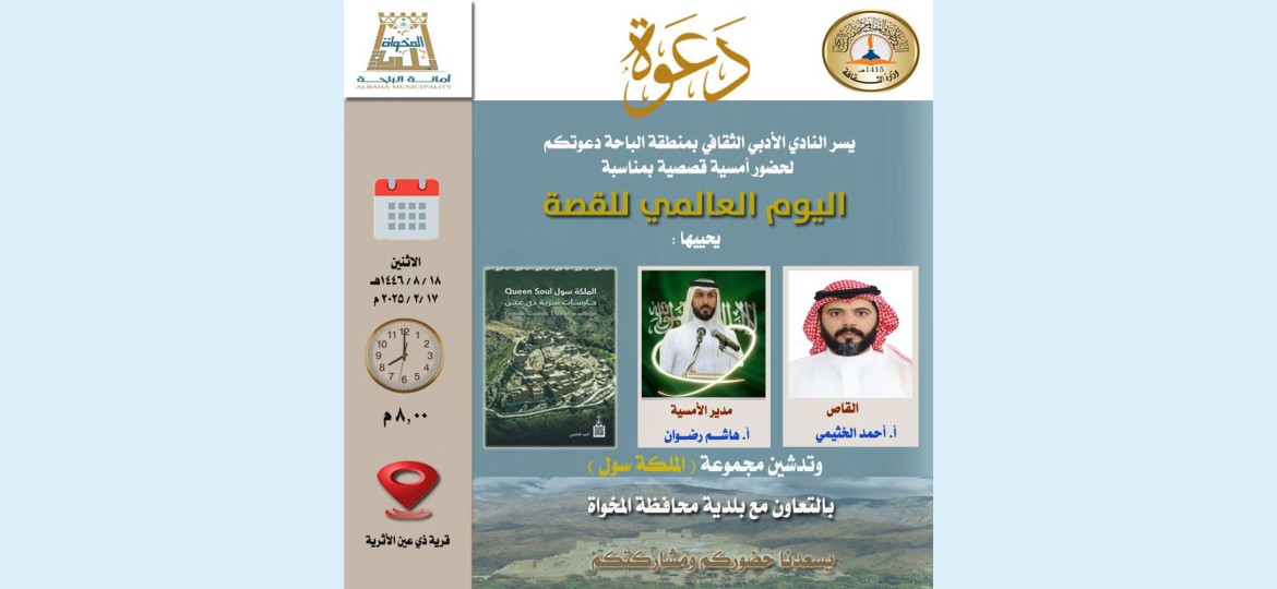 يعاود نادي الباحة الأدبي الثقافي كتابة قصة حضوره الثقافي الشتوي المختلف مساء الأثنين ١٨ / ٨ / ١٤٤٦هـ الموافق ١٧ / ٢ / ٢٠٢٥ م بالشراكة مع بلدية المخواة، حينما يدشن كتاب ( الملكة سول .. حارسات قرية ذي عين ) في محيط القرية التي يسرد حكاياتها هذا الإصدار فيما سيتحاور مؤلفه/ أحمد الخثيمي مع الحضور بإدارة الأديب هاشم الغامدي.