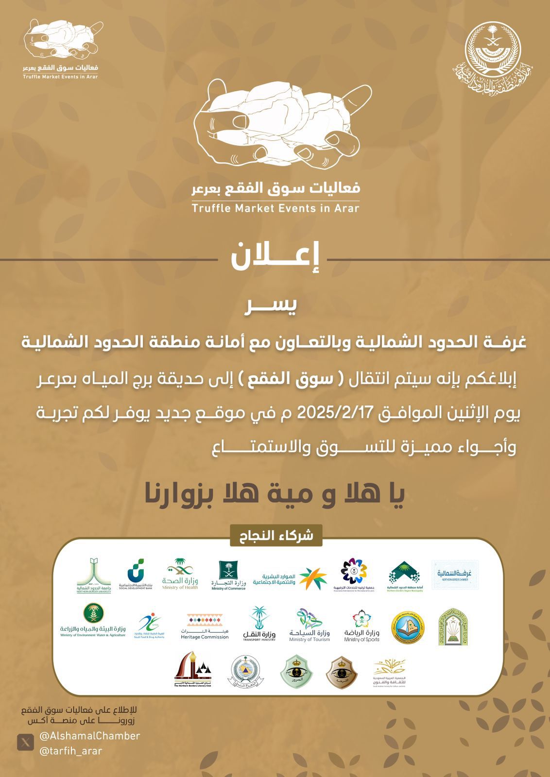 أعلنت غرفة الحدود الشمالية، بالتعاون مع أمانة منطقة الحدود الشمالية، عن انتقال سوق الفقع إلى حديقة برج المياه بعرعر، وذلك ابتداءً من يوم الإثنين 17 فبراير 2025، حيث يوفر الموقع الجديد تجربة مميزة تجمع بين التسوق والترفيه في أجواء مناسبة للزوار.