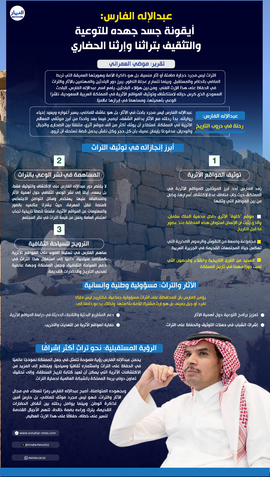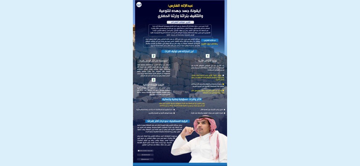 ساهم الفارس في تسليط الضوء على المواقع الأثرية كمقاصد سياحية، داعيًا إلى استغلال هذا التراث في دعم السياحة الثقافية، وجعل المملكة وجهة عالمية لمحبي التاريخ والحضارات القديمة.