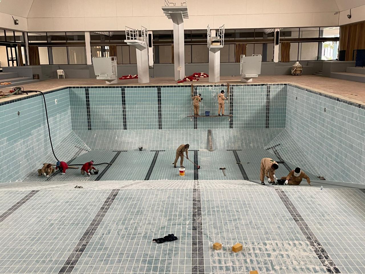 وقد شارك في أعمال الصيانة 30 عاملًا، حيث تضمنت الصيانة جوانب كهربائية شاملة للمسبح، وصيانة المراوش ودورات المياه، وصيانة الفلاتر بشكل كامل، بالإضافة إلى استبدال مضخات المياه، كما تم تركيب 4 سلالم إضافية، وتعبئة المسبح بمياه جديدة ومعالجتها.