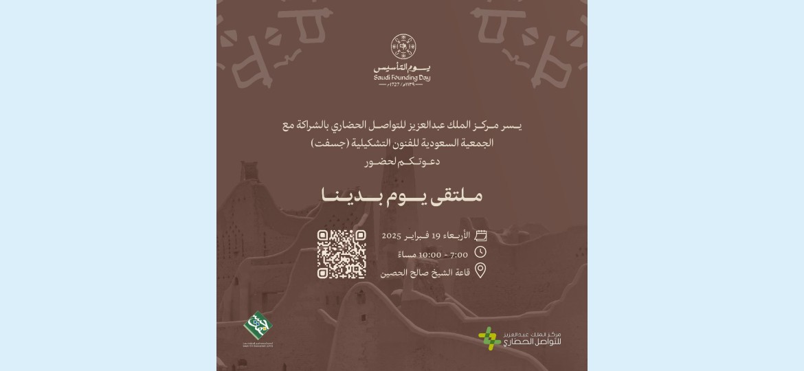 يعتزم مركز الملك عبد العزيز للتواصل الحضاري، بالتعاون مع الجمعية السعودية للفنون التشكيلية (جسفت)، تنظيم ملتقى "يوم بدينا" بالتزامن مع يوم التأسيس، بحضور عدد من المختصين والمهتمين، وذلك مساء يوم الأربعاء 20 شعبان 1446هـ الموافق 19 فبراير 2025 م، في مقر المركز.
