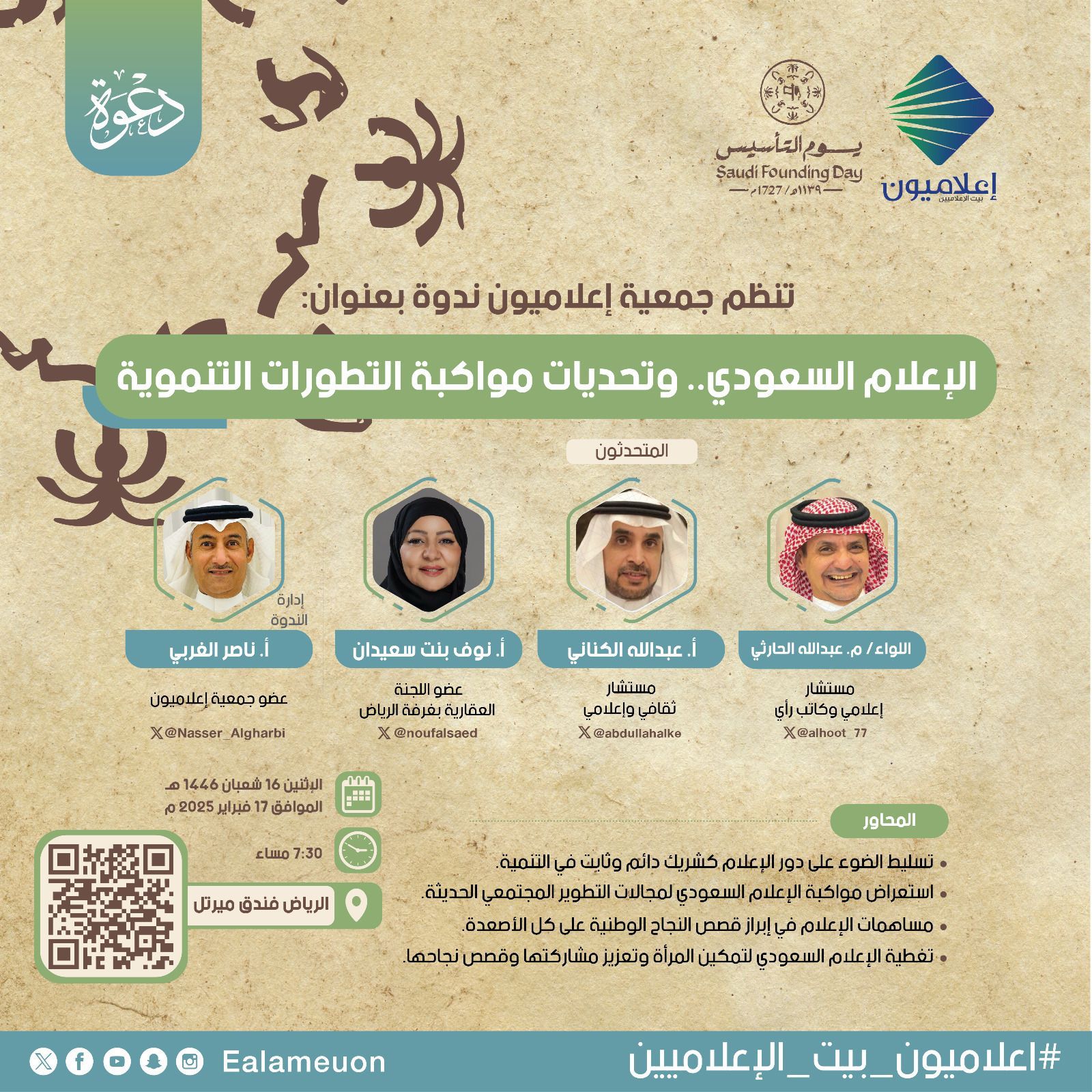 نظمت  جمعية إعلاميون  ندوة بعنوان “الإعلام السعودي وتحديات مواكبة التطورات التنموية”، وذلك بمناسبة يوم التأسيس السعودي، لمناقشة دور الإعلام في دعم مسيرة التنمية الوطنية، بحضور نخبة من الإعلاميين والخبراء .