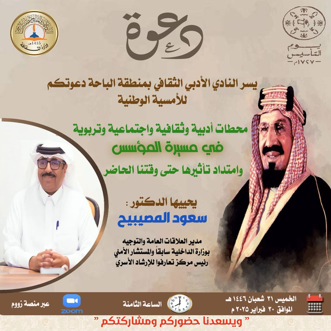 رئيس النادي الشاعر حسن بن محمد الزهراني قال أن هذه الأمسية تتزامن مع احتفالات الوطن بذكرى يوم التأسيس والذي يحتفي فيه النادي الأدبي الثقافي بالباحة كل عام برمز من خلال رموز الوطن الكبيرة وفي هذا العام سيكون الاحتفال مختلفاً فالاحتفال سيكون برمز الرموز الوطنية وموحد المملكة العربية السعودية الملك عبد العزيز بن عبد الرحمن آل سعود طيب الله ثراه من خلال محطات أدبية وثقافية واجتماعية وتربويّة في مسيرة المؤسس وامتداد تأثيرها حتى وقتنا الحاضر، وسوف يتحدث بإسهاب عن هذه المحطات ضيف النادي الكبير الدكتور سعود المصيبيح الساعه الثامنة من مساء يوم الخميس ٢١/ ٨ / ١٤٤٦هـ ، ٢٠ / ٢ / ٢٠٢٥م.