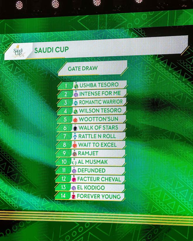 عقب مراسم القرعة التي أُقيمت في القرية الثقافية مساء الأربعاء، تم معرفة رقم البوابة من المدرب داني شوم والخيّال جيمس ماكدونالد، بينما يسعى "رومانتيك واريور" إلى تحويل تألقه على العشب في مختلف السباقات الدولية إلى نجاح على الأرضية الرملية في الرياض. وقال جيمس ماكدونالد عقب اختيار زوجته كيتلين الرقم على المسرح: "نحن سعداء بذلك. لم نأتِ إلى هنا بتوقعات محددة فيما يتعلق بالقرعة. يبدو أنه يتكيف بشكل جيد مع الأرضية الرملية، وكل الفريق سعيد جدًا به، وجوادي يتمتع بسرعة انطلاق جيدة."