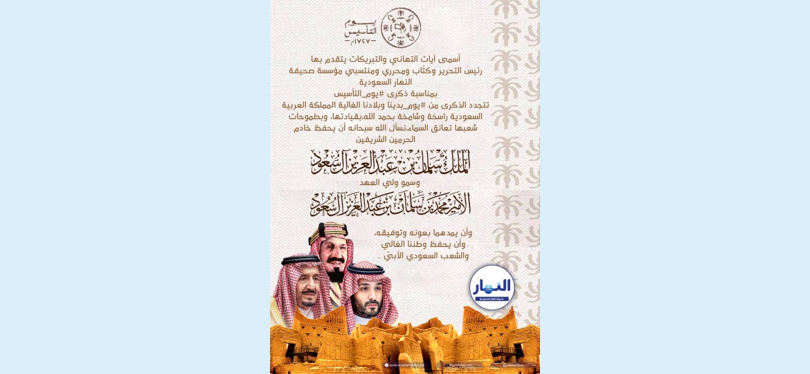 بمناسبة ذكرى يوم التأسيس، تتقدم صحيفة النهار السعودية بأسمى آيات التهاني والتبريكات إلى مقام خادم الحرمين الشريفين الملك سلمان بن عبد العزيز آل سعود، وسمو ولي العهد رئيس مجلس الأمير محمد بن سلمان بن عبد العزيز آل سعود.