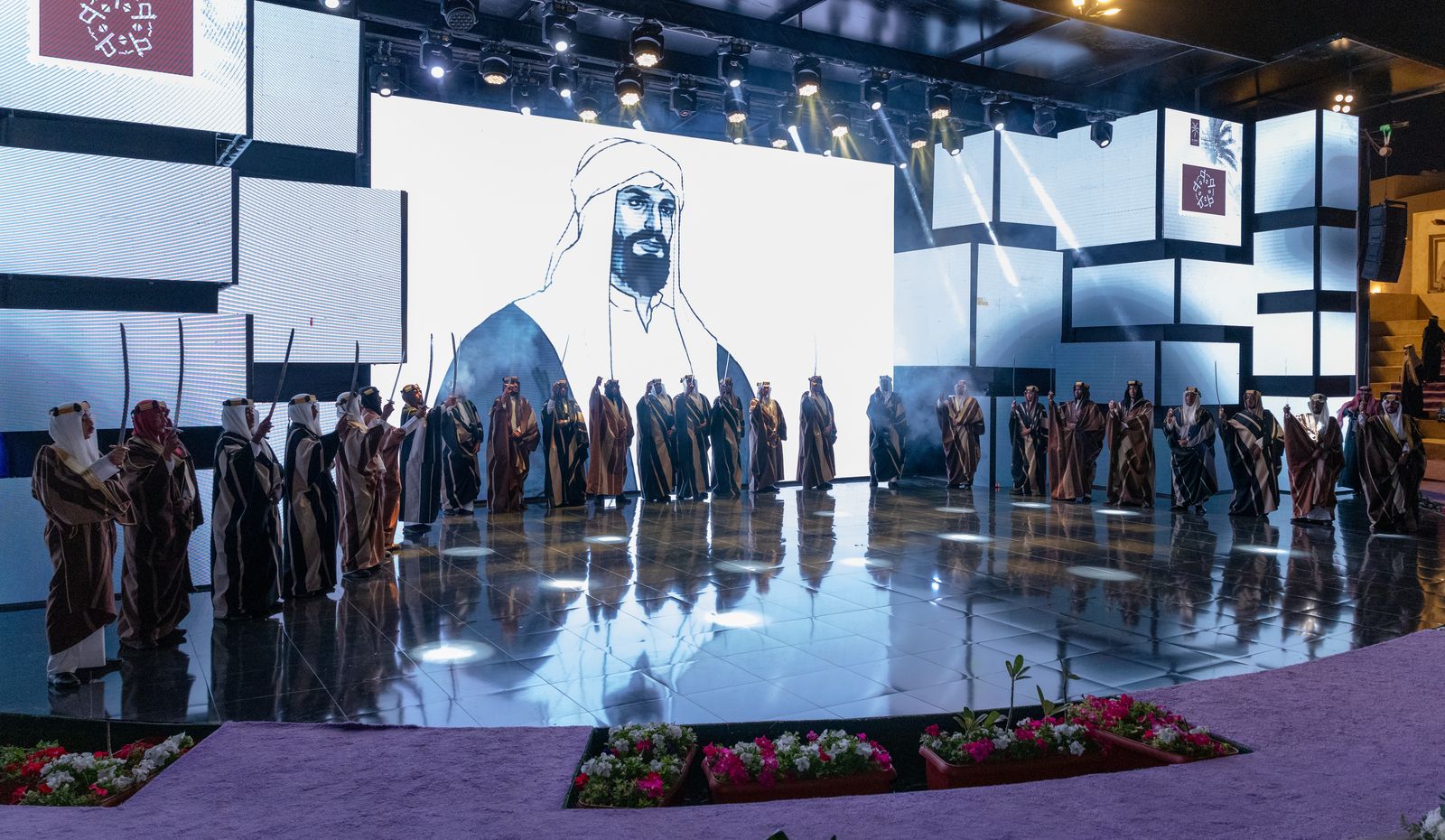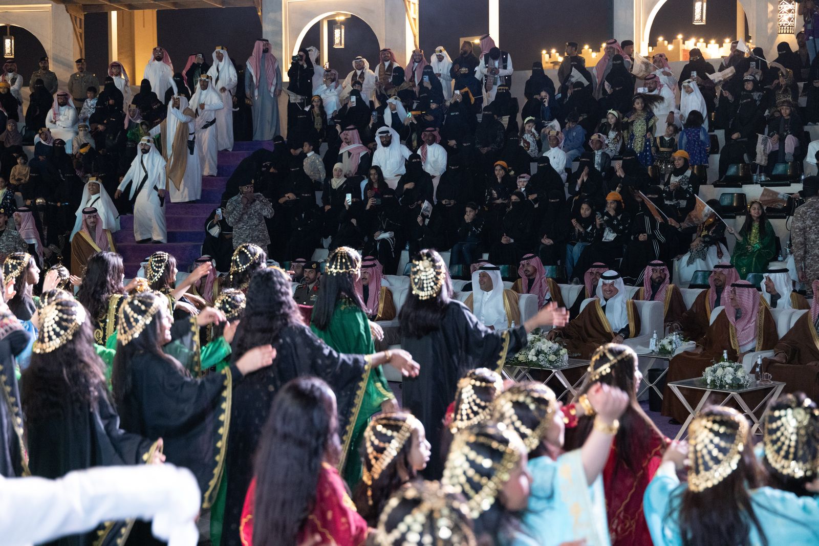 وتضمن الحفل عروضًا وطنية متنوعة، مثل المعزوفات الوطنية والعرضة السعودية، بالإضافة إلى أوبريت “درع حصين”، كما شهد المهرجان مسيرة حاشدة بالقرب من الأسوار الخارجية لموقع المهرجان، تضمنت عروض الخيالة والعرضة السعودية وعروض رجال العسس، كما تفاعل الحضور مع المعزوفات الوطنية التي قُدمت في ساحة المهرجان ، وخُصِّص أركان احتفائية بيوم التأسيس في الموقع، مثل منصات الأزياء الشعبية، وخيمة القهوة السعودية، وركن السيارات الكلاسيكية ، وحرص العديد من الزوار على ارتداء الأزياء الخاصة بهذا اليوم في مشهد ارتسمت فيه البهجة على الجميع .