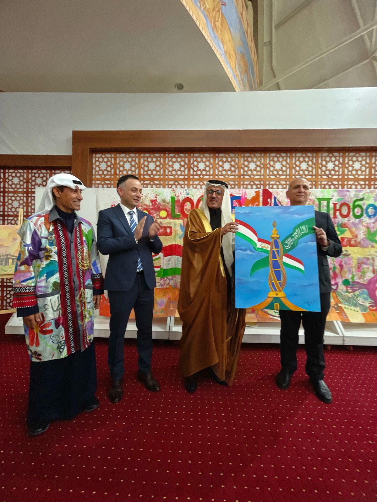 وفي ختام الحفل كرم سعادة السفير وليد الرشيدان الفنان عبدالعظيم الضامن بدرع السفارة لمشاركته المميزة بلوحة المحبة والسلام وإبراز التراث السعودي في لوحاته الفنية في حفل يوم التأسيس للسفارة السعودية في جمهورية طاجيكستان.