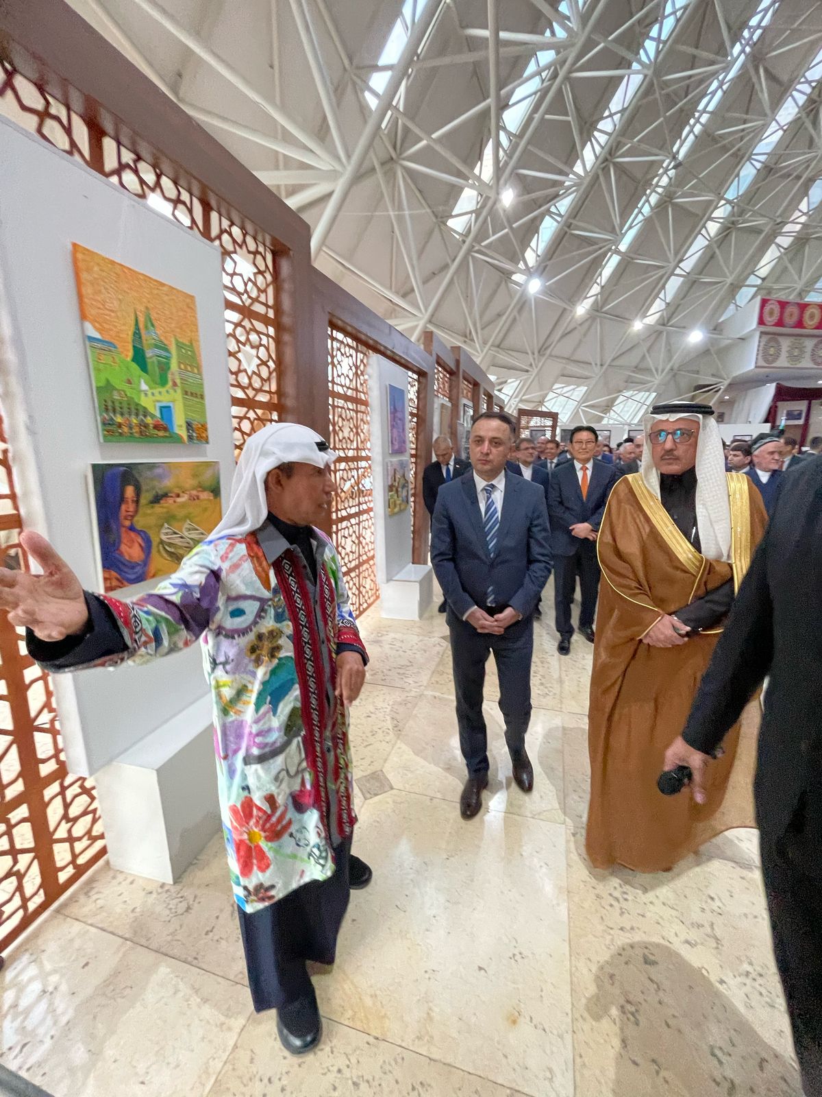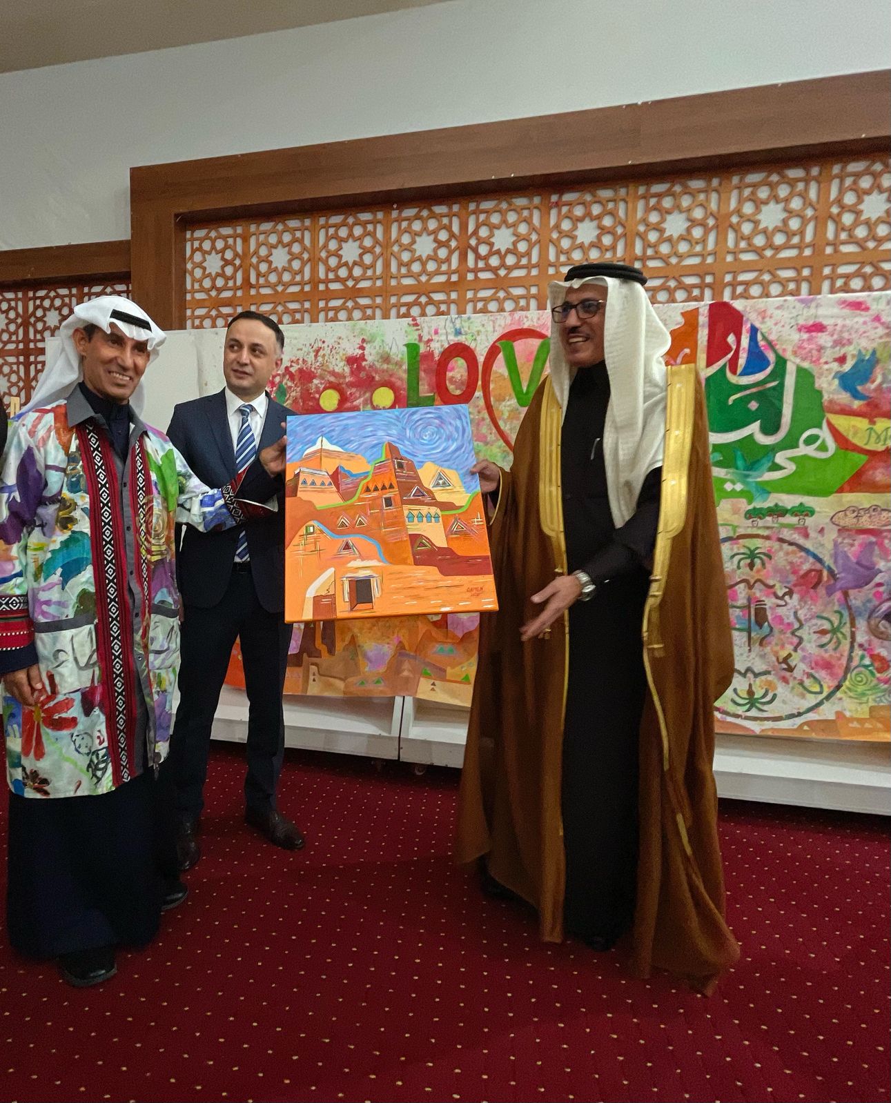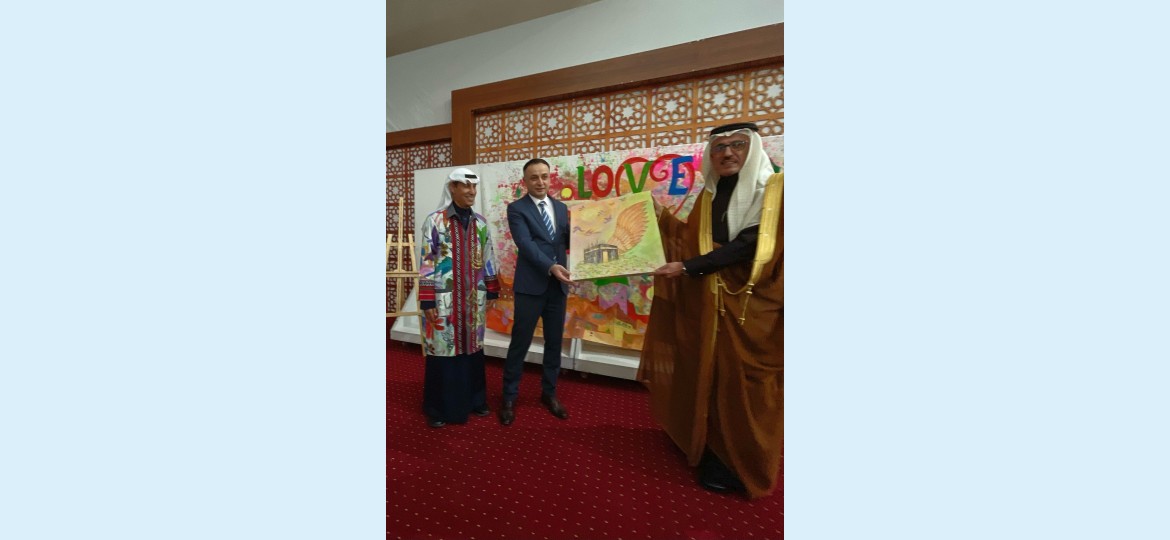 وقد شارك الفنان التشكيلي السعودي عبدالعظيم الضامن بمجموعة من الأعمال الفنية خصها لهذه المناسبة ، حيث بدأ بلوحة حب المطرزة بفسيفساء الوان تراث المملكة ولوحة المملكة تتوسطها الدرعية بمبانيها الجميلة ومباني عسير بزخارفها وقوارب الشرقية ، إضافة للوحة المحبة والسلام ، التي كانت محطة مهمة لتفاعل الجمهور برسم أجزاء منها ، حيث بدأ سعادة النائب الأول لرئيس لجنة الإستثمار وأملاك الدولة السيد يوسف زادة بالرسم مع سعادة السفير إيذاناً ببدء الرسم الرسم لجميع الحضور .