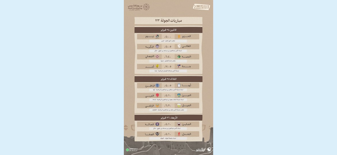 الجولة تحمل مواجهات قوية قد تؤثر بشكل كبير على الصدارة وترتيب الفرق في المراكز المتأخرة، مما يزيد من إثارتها في ظل الاحتفاء بيوم التأسيس.