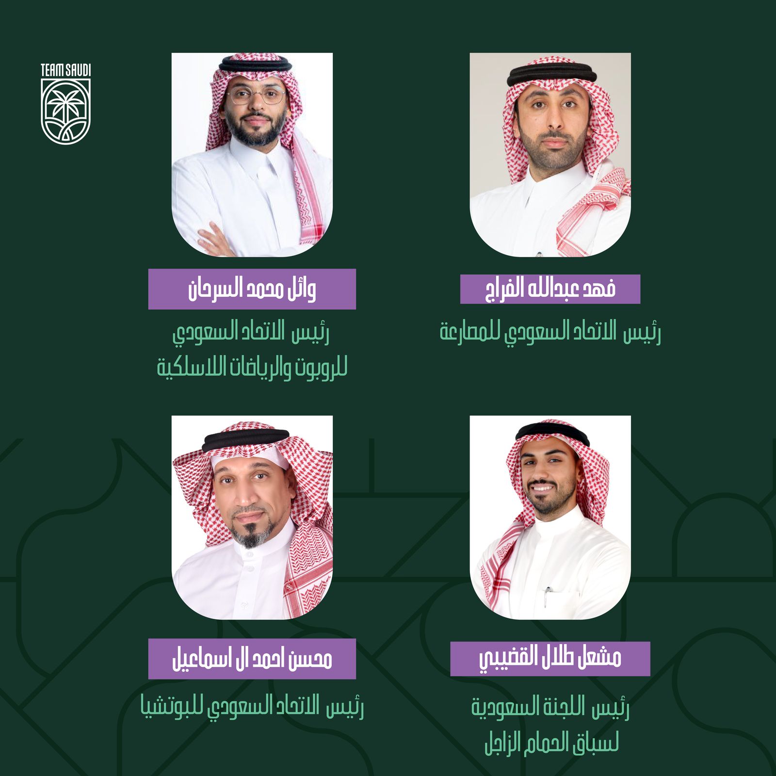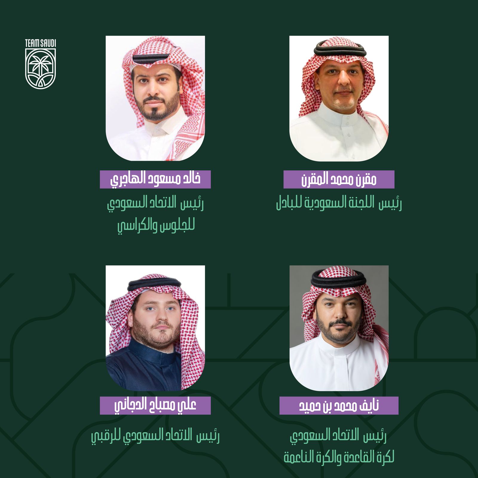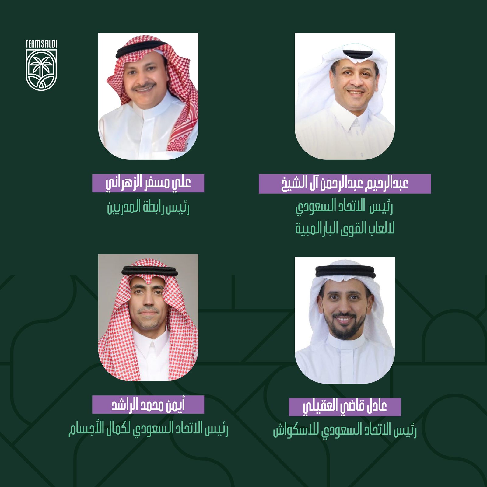 اعتمد اليوم الأحد، سمو رئيس اللجنة الأولمبية والبارالمبية السعودية، الأمير عبدالعزيز بن تركي الفيصل، التشكيل الجديد لعدد من مجالس إدارات الاتحادات واللجان والروابط الرياضية السعودية للدورة الانتخابية 2024-2028م، على النحو التالي:
