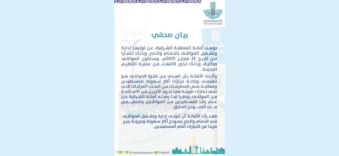 نوهت أمانة المنطقة الشرقية، عن توليها إدارة وتشغيل المواقف بالدمام والخبر، وذلك اعتبارا من اليوم الثلاثاء الموافق 25 فبراير 2025م، وستكون المواقف مجانية، وذلك لحين الانتهاء من عملية التنظيم الجديدة.