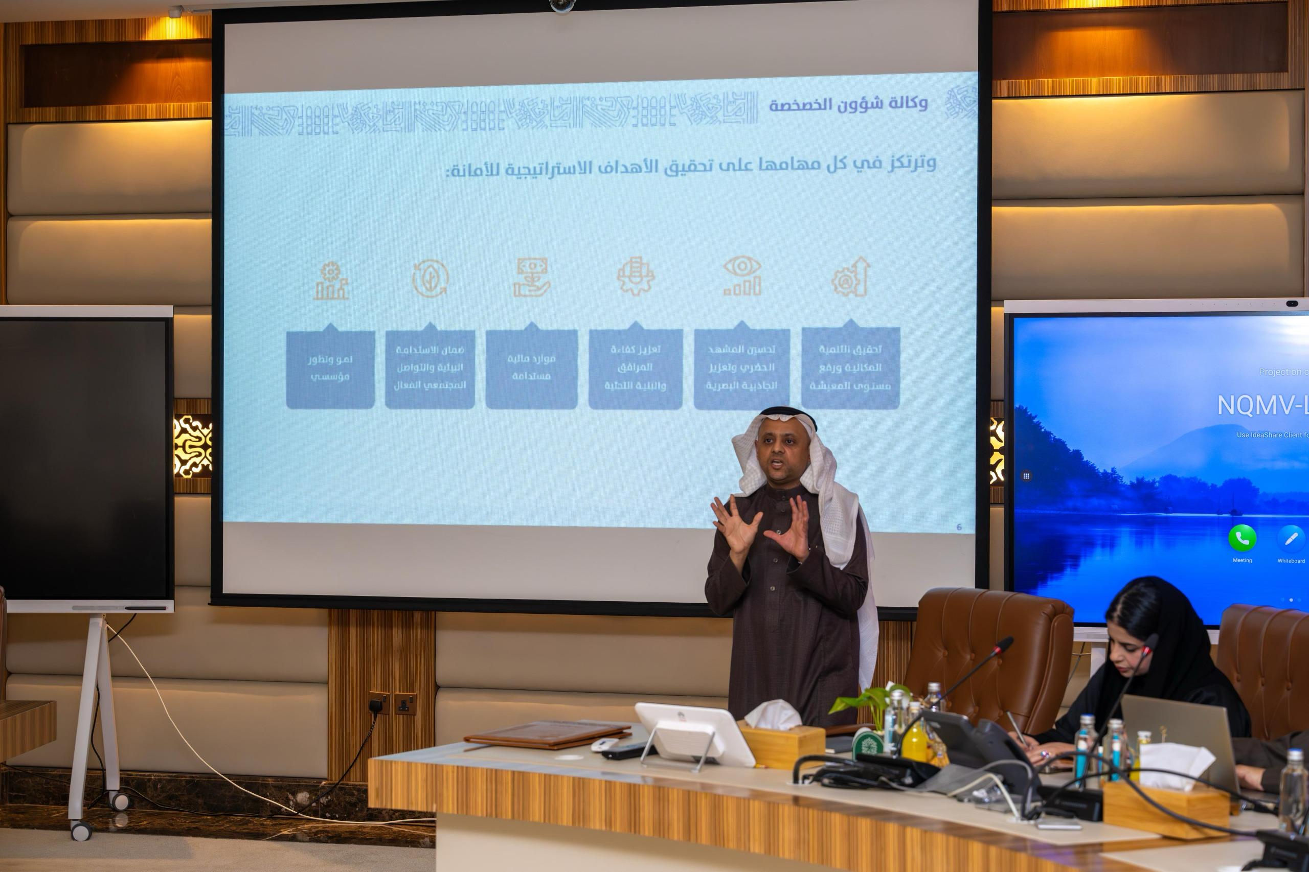 تلا ذلك عرض موسع لوكالة شؤون الخصخصة التي تنطلق من رؤية الأمانة، ولتحقيق أهداف الأمانة في هذا المجال، التي تسعى لها الأمانة وتخصص جهودها لتحقيق مستهدفات رؤية المملكة 2030 من خلال تمكين القطاع الخاص من المشاركة الفعالة في تقديم الخدمات وإدارة الأصول، كما تركز على تعزيز الاستدامة المالية ورفع كفاءة المرافق والبنية التحتية، وضمان الاستدامة البيئية والتواصل المجتمعي الفعال.