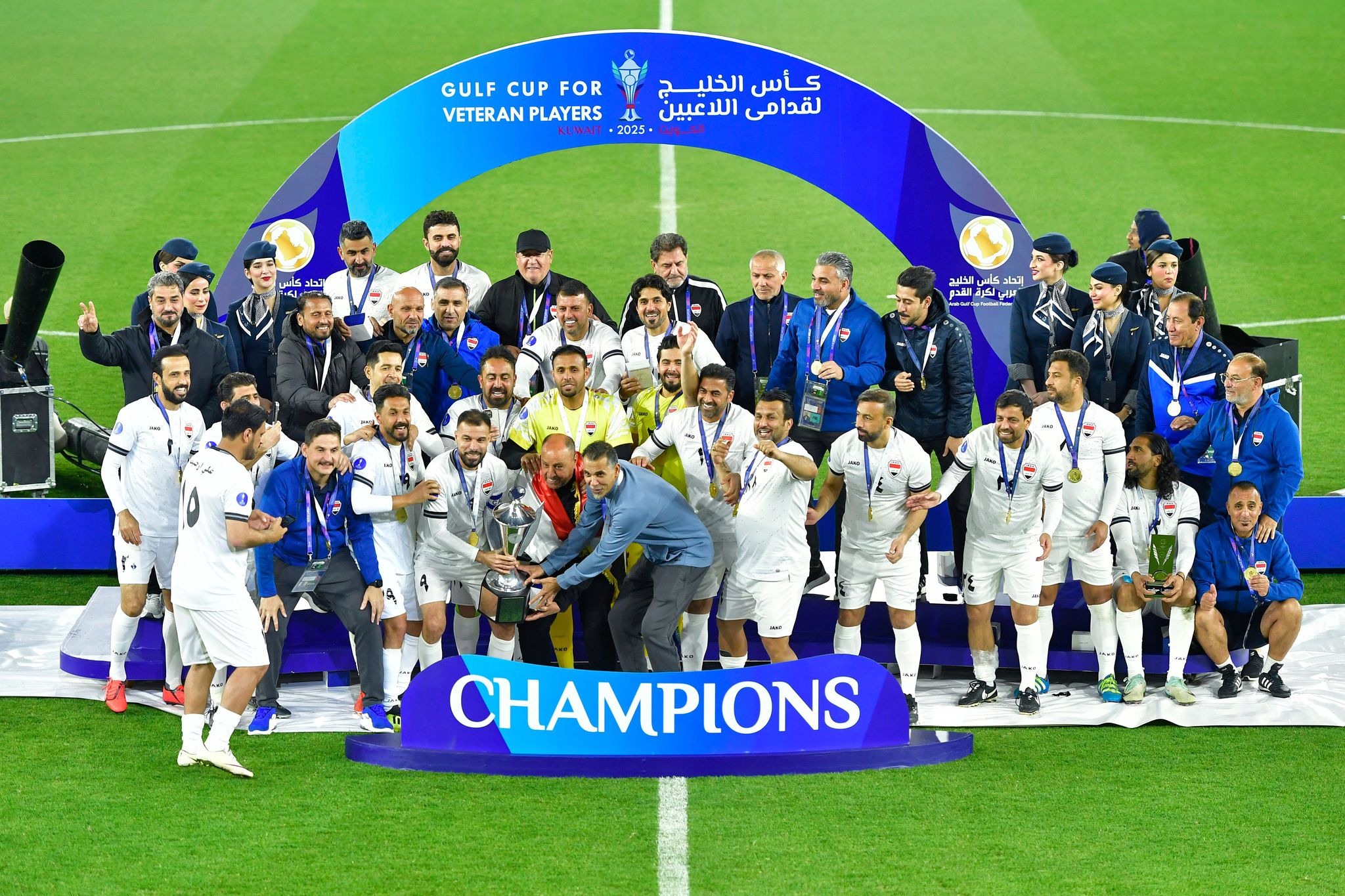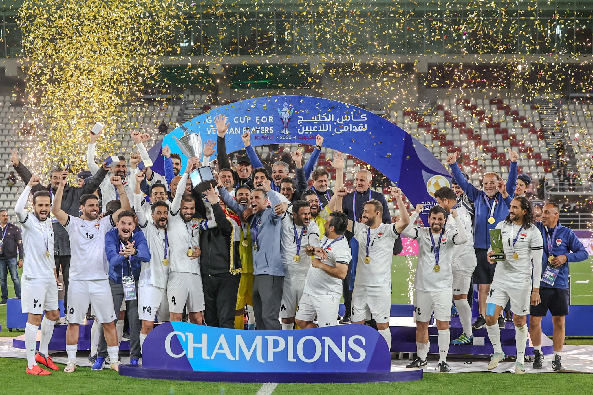 توج منتخب العراق بلقب بطولة كأس الخليج لقدامى اللاعبين بتغلبه على نظيره العماني 4-3 بركلات الترجيح بعد انتهاء الوقت الأصلي 0-0 في المباراة النهائية التي جمعتهما اليوم الأربعاء على ستاد جابر المبارك، بحضور وزير الصحة أحمد العوضي ورئيس مجلس إدارة الاتحاد الكويتي لكرة القدم الشيخ أحمد اليوسف الصباح ورئيس لجنة قدامى اللاعبين في الاتحاد الخليجي لكرة القدم حسن مطر السويدي ونائبه محسن مصبح.