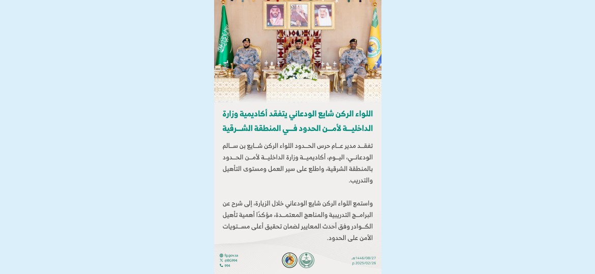 تفقد مدير عام حرس الحدود اللواء الركن شايع بن سالم الودعاني، اليوم، أكاديمية وزارة الداخلية لأمن الحدود بالمنطقة الشرقية، واطلع على سير العمل ومستوى التأهيل والتدريب.