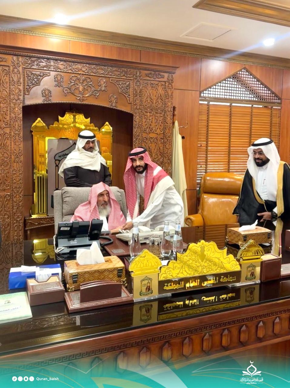 قام رئيس مجلس جمعية تحفيظ القرآن الكريم بمحافظة بيش، وأعضاءها ومديرها التنفيذي بزيارة لسماحة مفتي عام المملكة، رئيس هيئة كبار العلماء، والرئيس العام للبحوث العلمية والإفتاء، الشيخ عبدالعزيز بن عبدالله آل الشيخ، في مكتبه بالرئاسة العامة،.