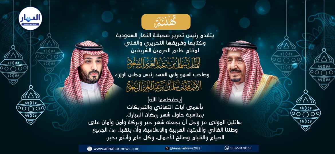 يتقدم رئيس تحرير صحيفة النهار السعودية وكتابها وفريقها التحريري والفني، لخادم الحرمين الشريفين، الملك سلمان بن عبدالعزيز، وسمو ولي العهد رئيس مجلس الوزراء، الأمير محمد بن سلمان، والشعب السعودي والأمة الإسلامية، بأسمى آيات التهاني والتبريكات بمناسبة حلول شهر رمضان المبارك.