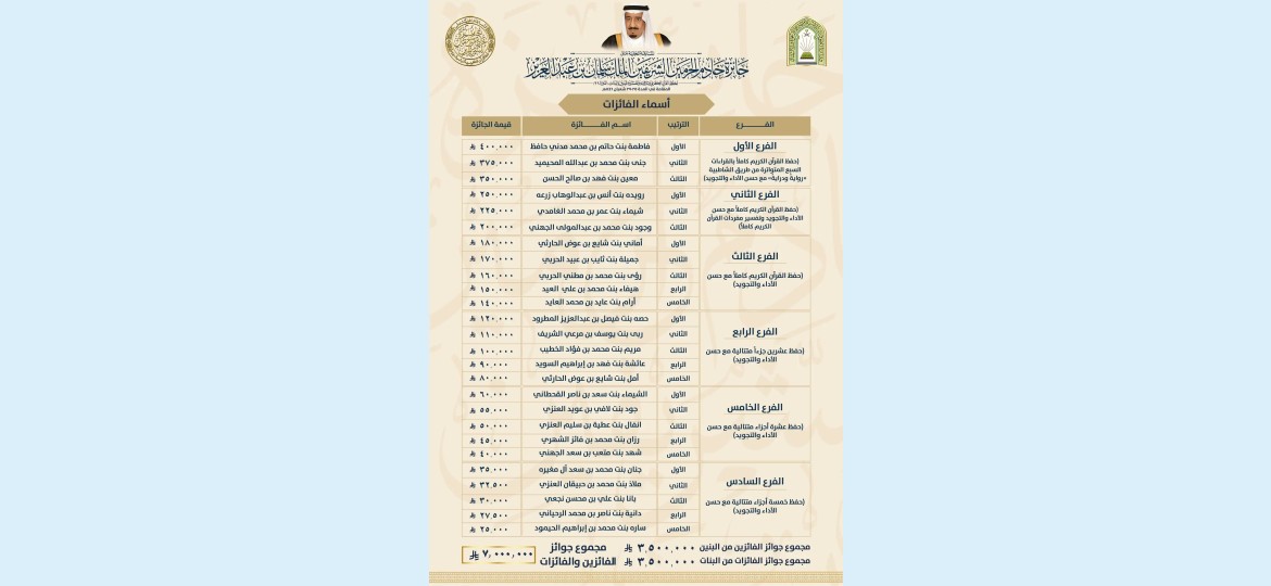 اعتمد معالي وزير الشؤون الإسلامية والدعوة والإرشاد، المشرف العام على المسابقات المحلية والدولية، الشيخ الدكتور عبداللطيف بن عبدالعزيز آل الشيخ، نتائج وأسماء الفائزات في المسابقة المحلية على جائزة خادم الحرمين الشريفين الملك سلمان بن عبدالعزيز آل سعود لحفظ القرآن الكريم وتلاوته وتفسيره للبنين والبنات في دورتها السادسة والعشرين، التي عُقدت تصفياتها النهائية في مدينة الرياض خلال الفترة من 25 – 29 شعبان لعام 1446هـ، بمشاركة 125 متسابقًا ومتسابقةً تنافسوا على فروع المسابقة الستة ويبلغ إجمالي الجوائز أكثر من 7.000.000 ملايين ريال.