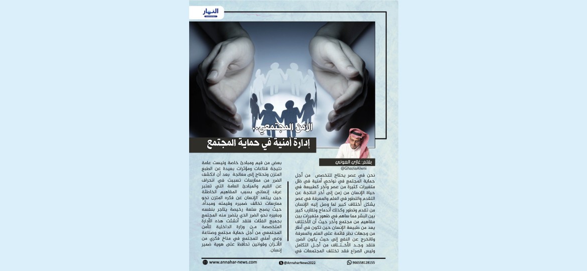 حيث يصبح سلعة رخيصة يتاجر بنفسه وبغيره نحو الضرر الذي يتضرر منه المجتمع بجميع الفئات فلقد أنشئت هذه الأدارة المتخصصة من وزارة الداخلية للأمن المجتمعي من أجل حماية مجتمع وصناعة وعي أمني للمجتمع في مناخ فكري من الأتزان وقوانين تحافظ على هوية ضمير إنسان.