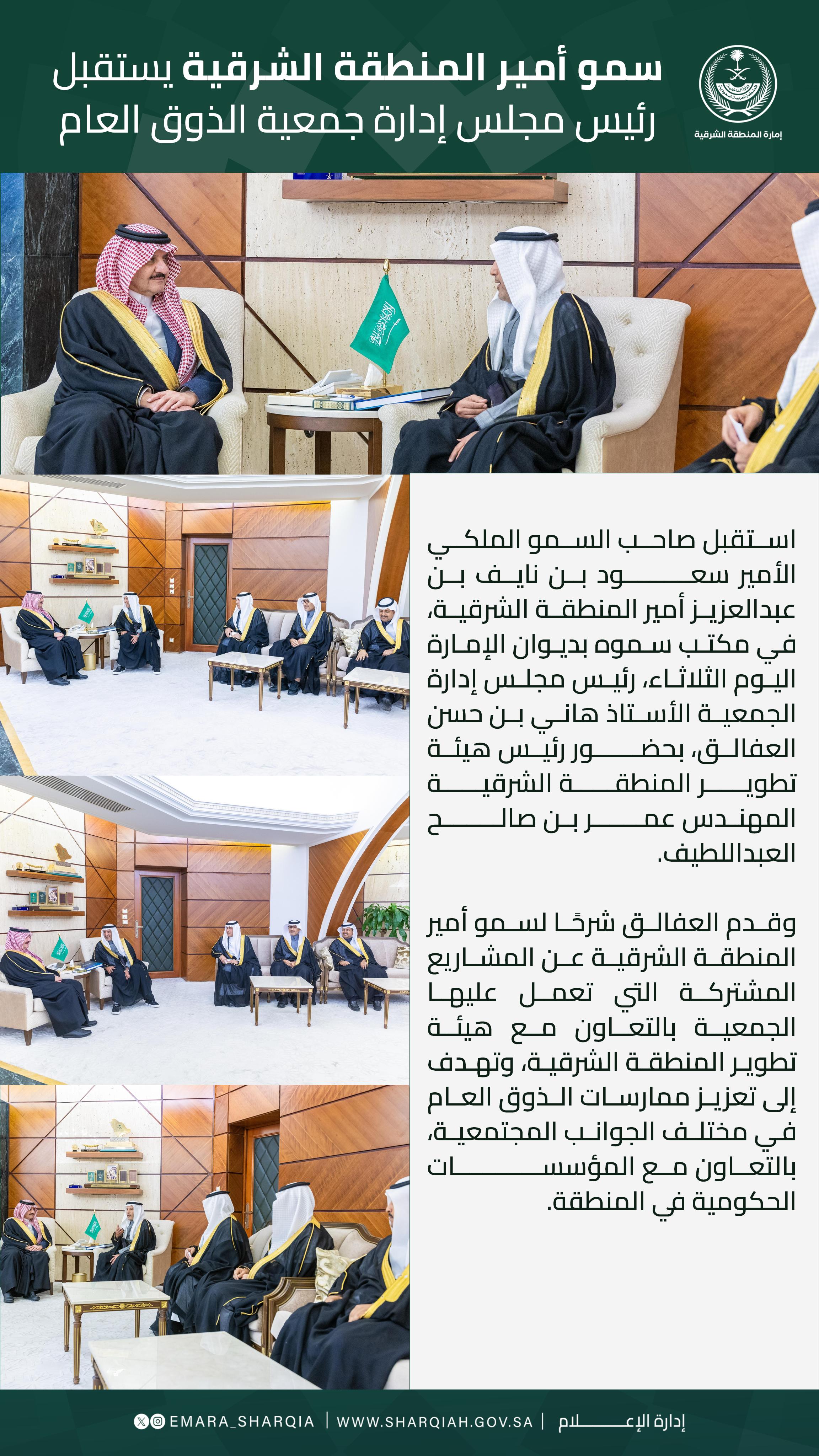 استقبل صاحب السمو الملكي الأمير سعود بن نايف بن عبدالعزيز أمير المنطقة الشرقية، في مكتب سموه بديوان الإمارة اليوم الثلاثاء، رئيس مجلس إدارة الجمعية الأستاذ هاني بن حسن العفالق، بحضور رئيس هيئة تطوير المنطقة الشرقية المهندس عمر بن صالح العبداللطيف.