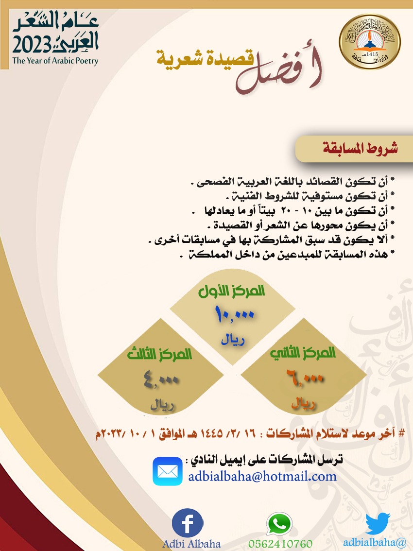 أعلن النادي الأدبي الثقافي بمنطقة الباحة عن عدد من المسابقات في مجال الشعر والدراسات النقدية وخصص جوائز قيمة للفائزين بحسب استيفاء الشروط وقال رئيس النادي الأدبي الثقافي بالباحة الأستاذ حسن الزهراني: بأن هذه المسابقة تتزامن مع عام الشعر العربي