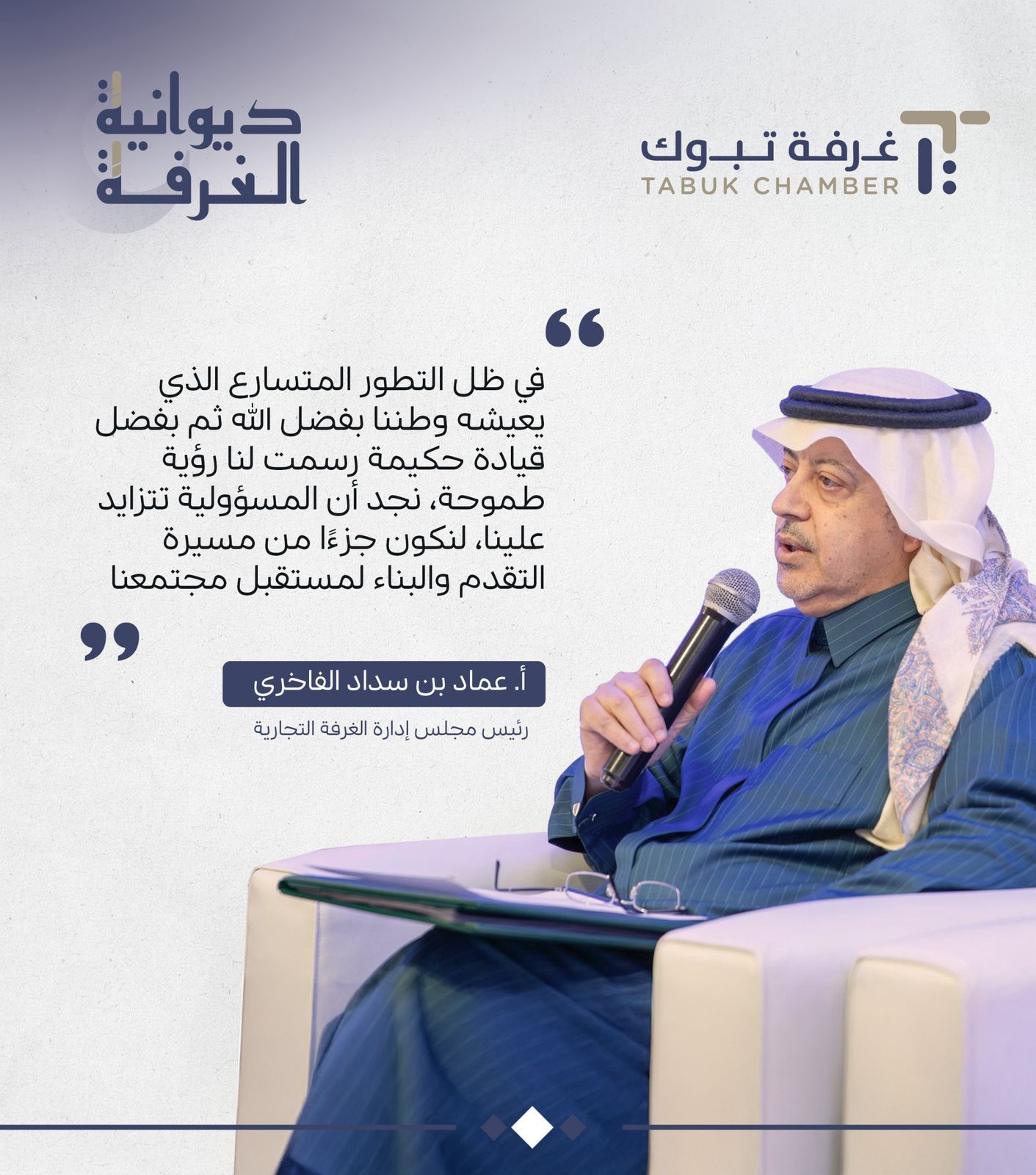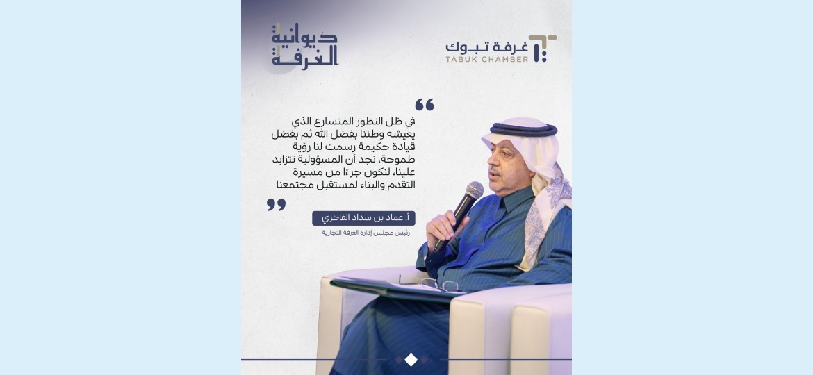 دشن رئيس مجلس إدارة  غرفة تبوك  أ.عماد بن سداد الفاخري، أمس، فعاليات "  ديوانية الغرفة  "، بحضور نخبة من رجال وسيدات الأعمال وأعضاء مجلس الإدارة ورؤساء اللجان القطاعية بالغرفة، وعدد من الهمتمين بالشأن الإقتصادي بالمنطقة.